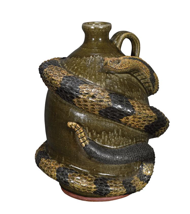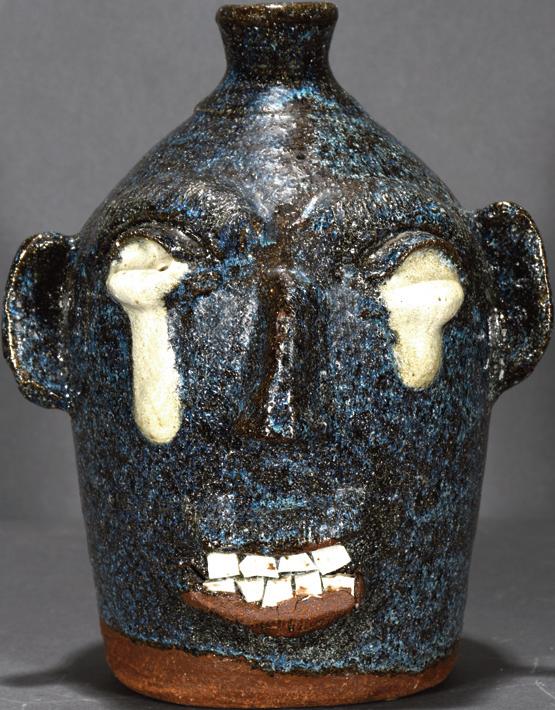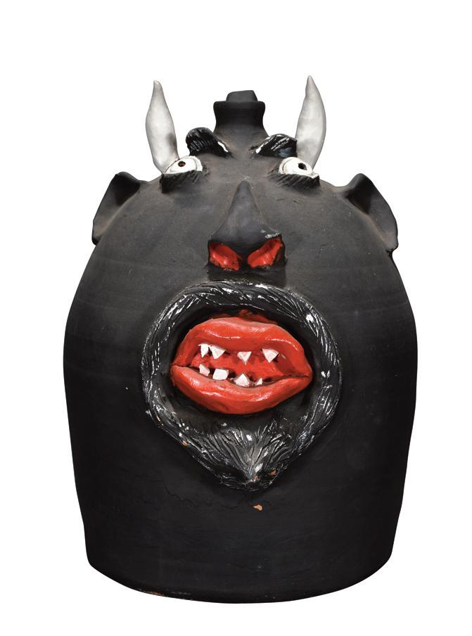Three Gallon Black Devil Face Jug. Signed. Painted glaze with china teeth. Excellent condition. 14" h. Est. $1,000-2,000. Buyer is responsible for shipping.