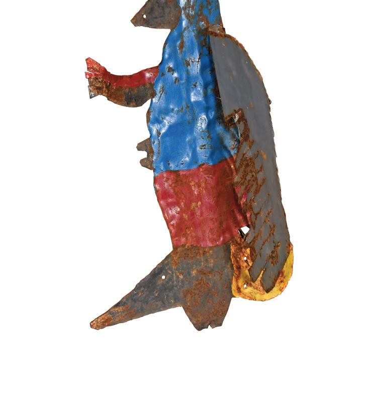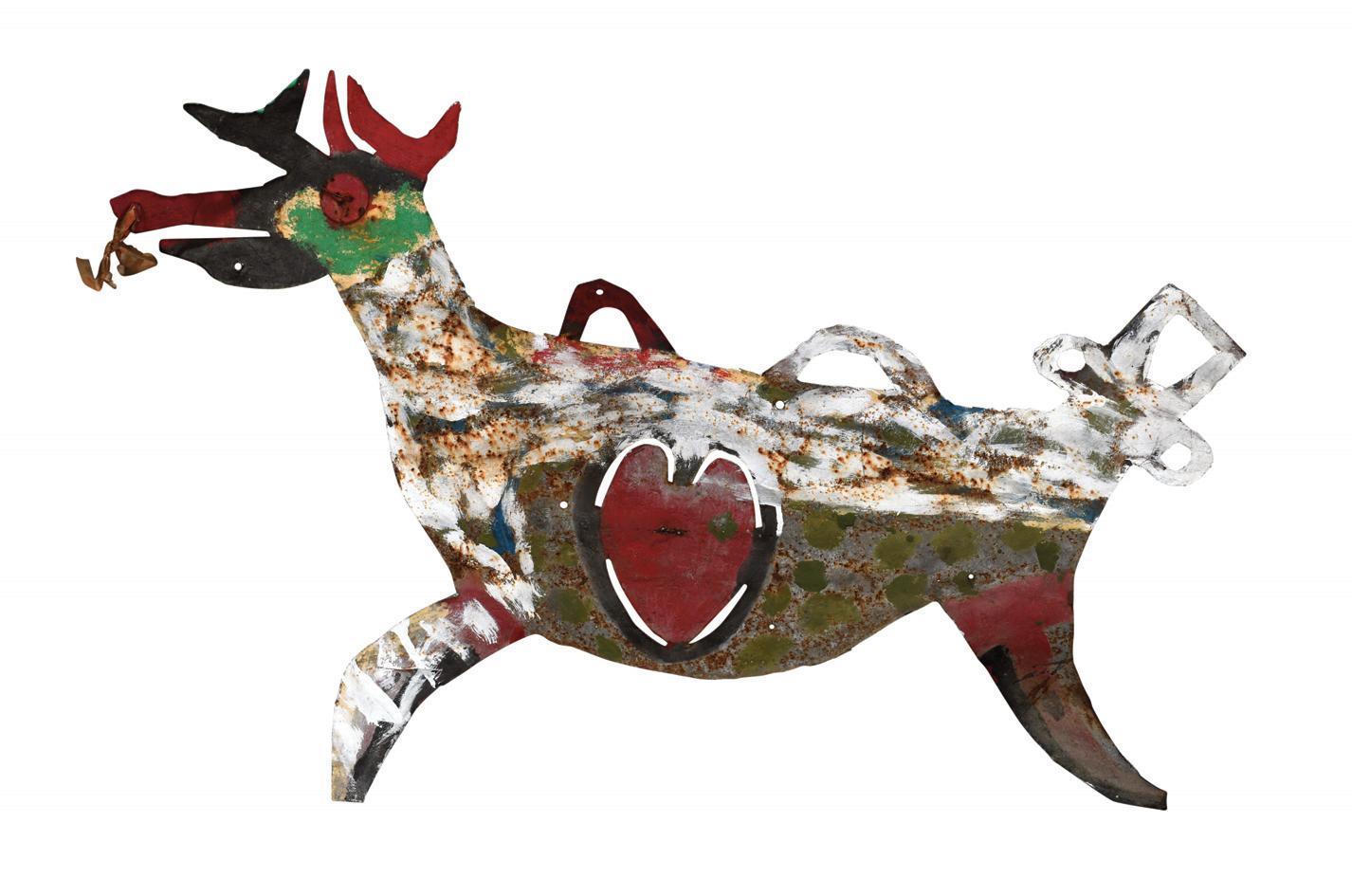 Not signed. Paint on found roofing tin. Environmental wear and holes from previous use, otherwise excellent condition.