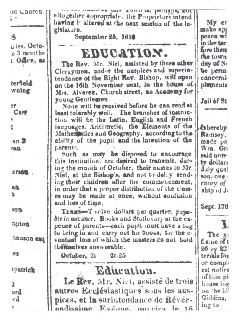 Tuition was set at $12 per quarter, not including books and stationery or bags in which to carry them. The Gazette advertisement hinted at the financial straits of the new St. Louis Academy when it emphasized that its teachers would not “hold themselves answerable” for lost books. The advertisement’s typos—including a misspelling of Alvarez—also suggested a certain haphazard aspect to the new endeavor.