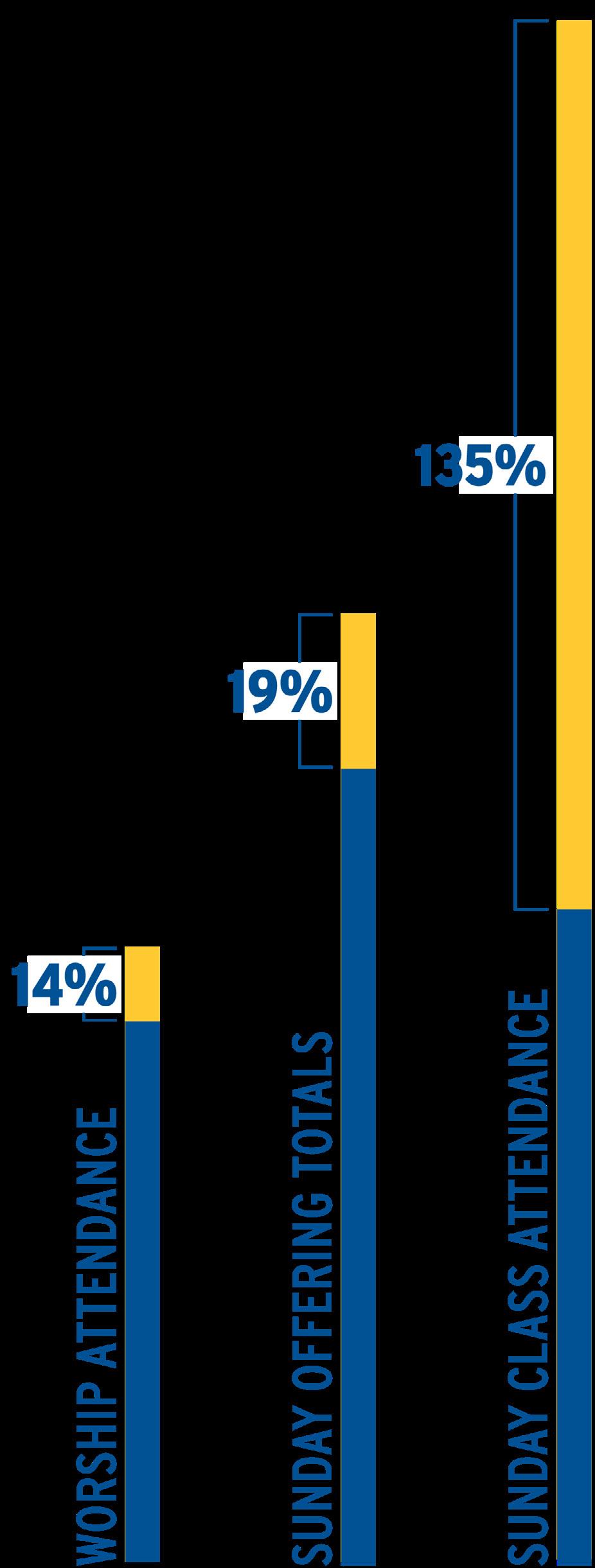Sunday worship attendance is defined as simply as it sounds: How many people are physically present in our Sunday worship services. This number does not include those who stream our worship services online, although we do track that number and it increased in 2025. This number does not include extra services throughout the week that are not part of our Sunday worship offering. In the first 49 weeks of 2025 compared to the same weeks in 2024, we’ve experienced a 14% increase in worship attendance.