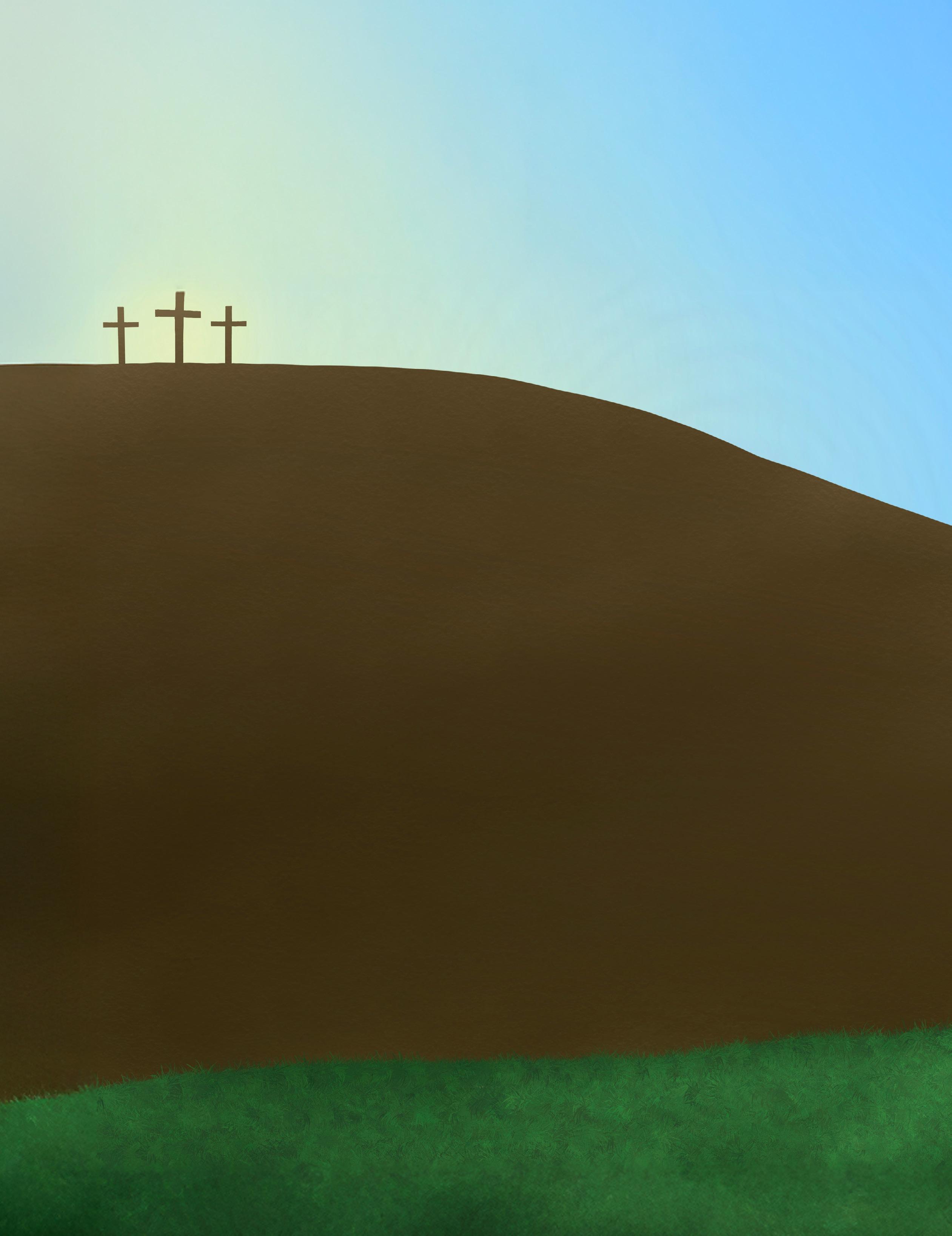 Simon carried it to a place called Golgotha. Golgotha means “face.” If you were to look at that hillside, it looked like there were two eyes, a nose, and a mouth. That’s how it got its name, and that’s where Jesus was crucified. Two thieves who were caught stealing stuff were also condemned to death. They were crucified on each side of Jesus. It was Friday afternoon, and at about three o’clock, many people gathered around and heard Jesus say, “I give up my spirit.”