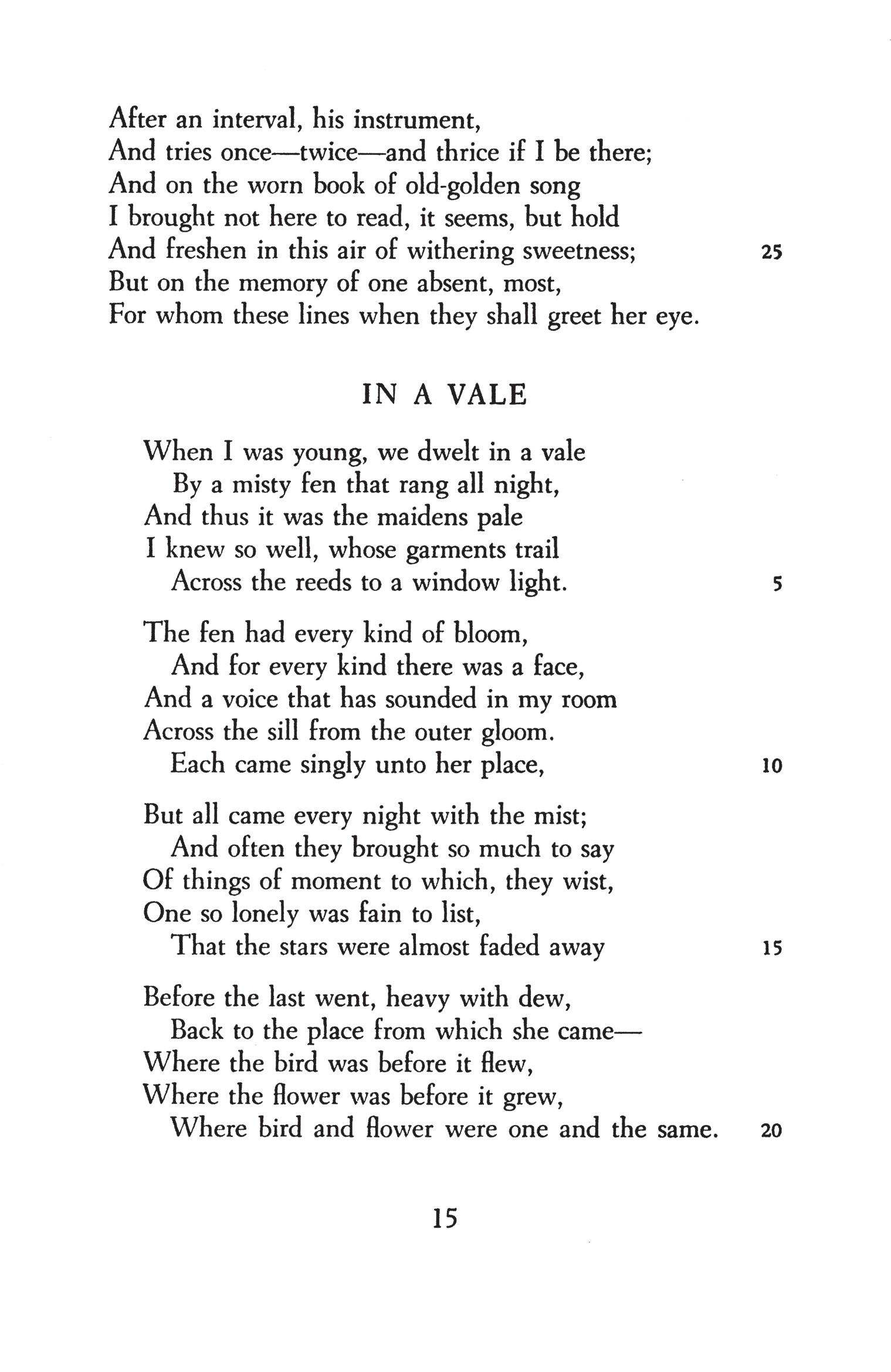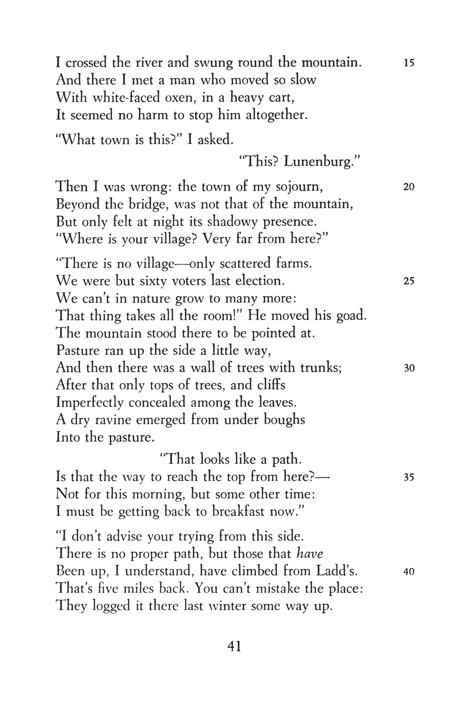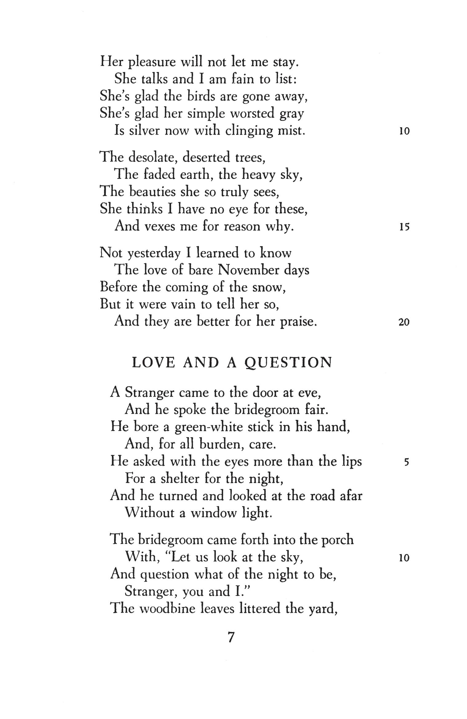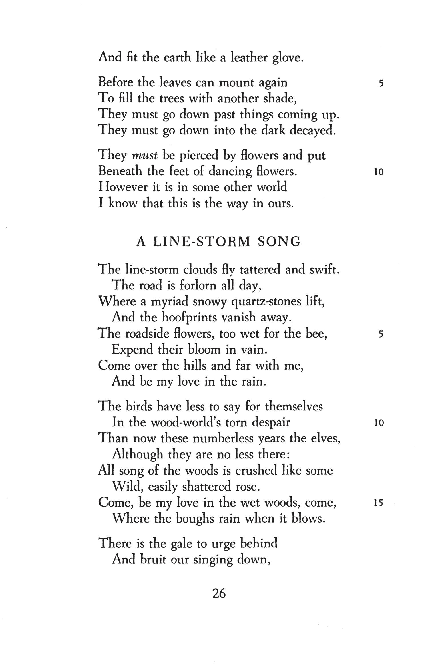 Robert Frost was born in San Francisco in 1874. After the death of his father he moved with his mother and sister to Massachusetts. His first collection, A Boy’s Will, was published in 1913. In 1924 he won the first of four Pulitzer Prizes for his fourth book, New Hampshire. In the 1930s, as he became ever more revered, he suffered a series of family tragedies: his youngest child Marjorie died in 1934, his wife Elinor in 1938 and his son Carol in 1940. Another daughter, Irma, suffered from mental illness. Frost’s last major collection, A Witness Tree (1942), contains a number of poems reflecting these disasters. In 1957 Robert Frost received honorary degrees from the universities of Oxford and Cambridge. He died in January 1963.