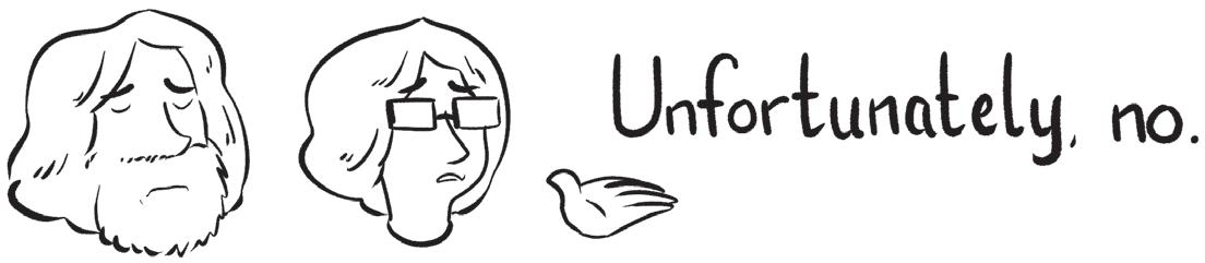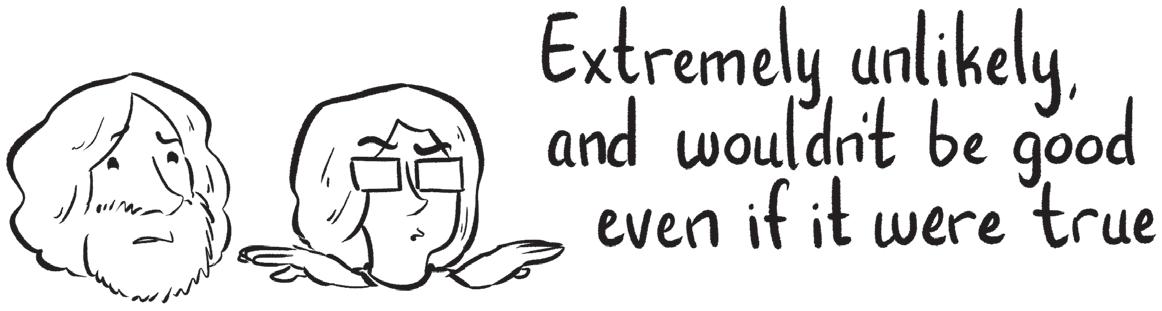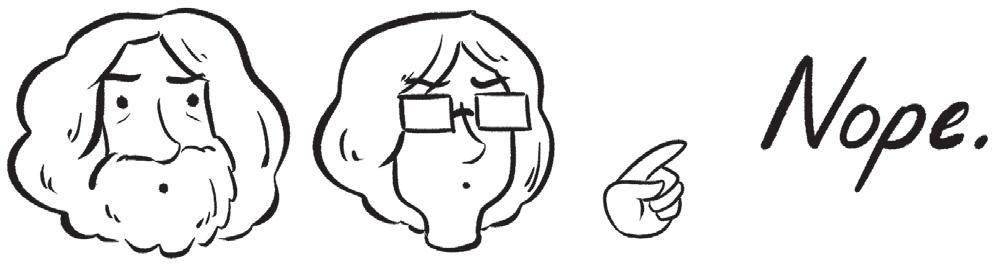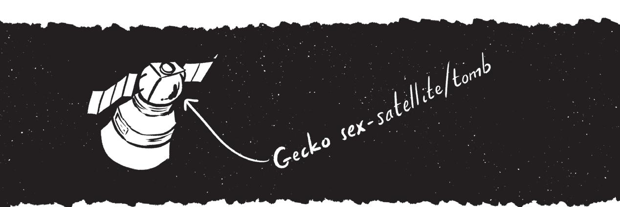 But fi rst, we should introduce ourselves. Hi. We’re Kelly and Zach Weinersmith. Kelly is a biologist and Zach is a cartoonist. We’re also a wife-and-husband research team who’ve spent the last four years trying to understand how humans will become space settlers. We’ve gone to conferences, conducted endless interviews, and collected, at last count, twentyseven shelves of books and papers on space settlement and related subjects. We are space geeks. We love rocket launches and zero gravity antics. We love space history’s strange corners like red cubes and tampon bandoliers. We love visionary plans for a glorious future. We are also very skeptical people. If you want to visualize us, imagine John F. Kennedy giving a beautiful, uplifting speech on sailing “this new ocean,” and then notice in the background two people squinting at the middle distance, thinking “but is it really like an ocean?”