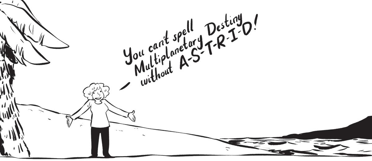 Astrid is a space settler and she’s ready to bid farewell to this pale blue dot. With each passing chapter we’ll change her to illustrate what we’ve learned so far. As we go, we’ll scale from what she’s wearing to where she’s living to her new space nation, which hopefully won’t get nuked by Earth. By the end, you’ll be able to decide for yourself whether her decision to settle the solar system was a smart one, either for herself or the world she left behind.