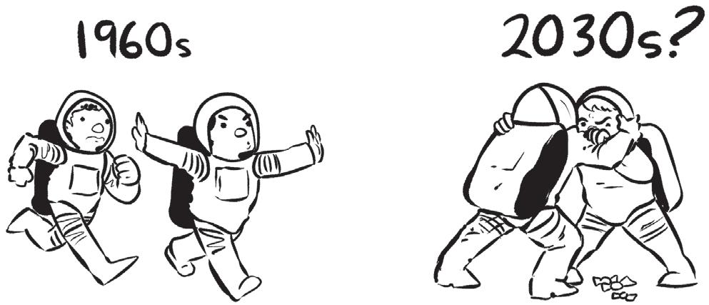 If you want to safely settle space, technology is hard, but it isn’t enough; we also need at least somewhat harmonious international relations. at’s not looking great on Earth right this second, and space may not be all that much different. In a 2022 report put out by the Defense Innovation Unit, written by workshop attendees hailing from organizations like the US Space Force and Air Force, the authors say a new “Space Race” with China has already started. As they write: “ e competition represents a major inflection point not just for the 21st Century but for all of human history. e New Space Race seeks to achieve nothing less than the permanent establishment of the fi rst off-planet, human settlement propelled and sustained by a thriving to-, in-, and from-space economy.”
