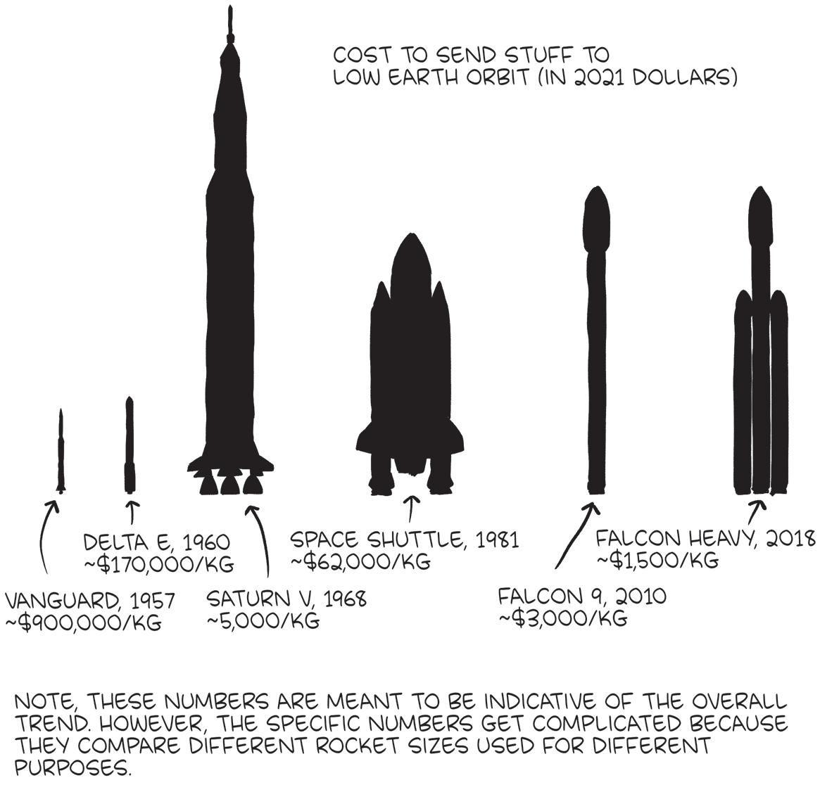 Sadly for many a geeky heart, the prices stopped falling around the early 1970s, and the Space Shuttle, which was supposed to make travel routine, cheap, and safe, failed on all three fronts, remaining, by one estimate, the costliest way to put mass in orbit for decades. at was the state of play until the 2010s when, largely as a result of a US policy shift and SpaceX in particular, the cost of putting stuff in space began to fall dramatically again.