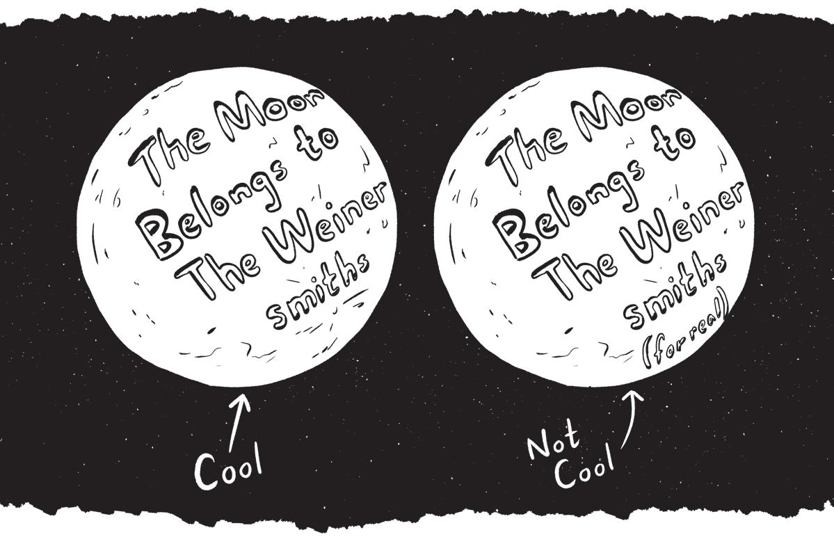 to appropriate any territory. However, under many modern interpretations, and absolutely under the American interpretation, everybody can use as much of the surface as they like. Let’s sit on that a second: you can use the entire lunar surface any way you please, ad libitum, as long as you never say “ is is mine in the sense of being my territory.” Legally, we could probably write “ e Moon Belongs to the Weinersmiths, You Filthy Earth Scum” in giant letters visible from Earth, as long as we didn’t claim to actually believe it.