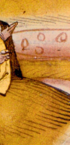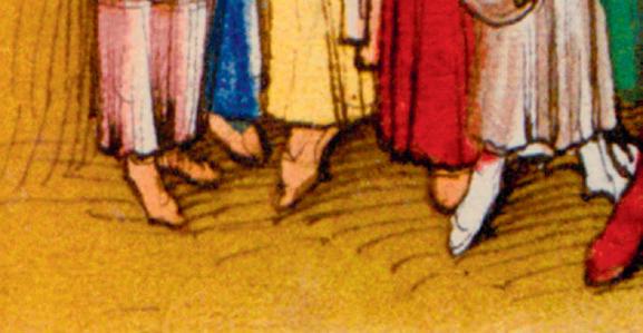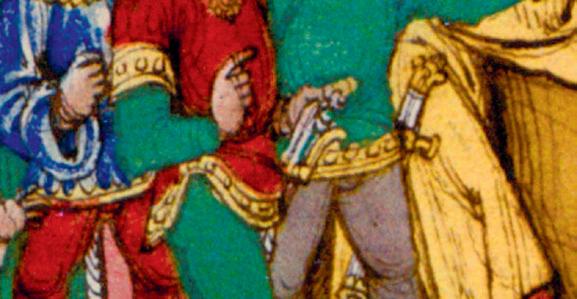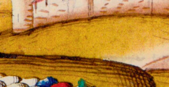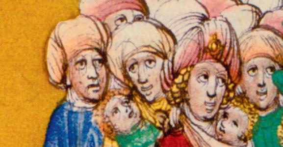 closely huddled people obviously seeking protection takes up almost a third of the space. Men are depicted in detail in the front, with women and children of various ages to their rear. The people in the foremost row gesture with their arms, hands and ngers expectantly towards the city. In front of them, a path winds its way to the gate. The only indication that these new arrivals are Gypsies is in the caption. This illustration hardly conforms to the impressions communicated in the chronicles’ reports. There are no horses or pack animals, and the people have few possessions or baggage. They don’t wear the ripped, torn and patched-together rags Gypsies do in later depictions. Instead, they appear in ‘Saracen’ or Oriental garb with turban-like head coverings. The at round hats reminiscent of plates worn by the women in other early depictions are also missing.6 Everyone, even the children, is wearing shoes. Their shirts and robes are colourful but not brightly patterned. Golden pins adorn the men’s turbans and gold-trimmed shirts, and they bear ornate, curved swords. One of the gures is singled out as the leader by his position, posture, dress and copious beard. The gure is highly comparable to the aristocrats depicted in the Spiez Chronicle. There are no indications, such as crosses, that these people have been baptized. And in contrast to the caption, these ‘black heathens’ are all light-skinned and blond.