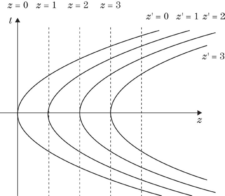 Let’sdothesamethingfortheacceleratedcoordinatesystem.The transformationequationisnowequation(8)linking z ′ and z .The othercoordinatesdon’tchange.Again,infigure4,everypointin space-timehastwopairsofcoordinates(z,t)and(z ′ ,t′ ).The timetrajectoriesoffixed z ,representedwithdottedlines,don’t change.Butnowthetimetrajectoriesoffixed z ′ areparabolas lyingontheirside.Wecanevenrepresentnegativetimesinthe past.Thinkoftheelevatorthatwasinitiallymovingdownward withanegativevelocitybutapositiveacceleration g (inother words,slowingdown).Thentheelevatorbouncesbackupward