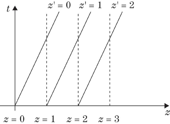Infigure3,everypoint–alsocalled event –inspace-timehasa pairofcoordinates z and t inthestationaryframeandalsoapair ofcoordinates z ′ and t′ intheelevatorframe.Ofcourse, t′ = t andweleftoutthetwootherspatialcoordinates x and y ,which don’tchangebetweenthestationaryframeandtheelevator.We representedthetimetrajectoriesoffixed z withdottedlinesand offixed z ′ withsolidlines.