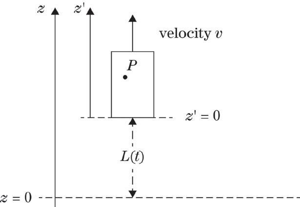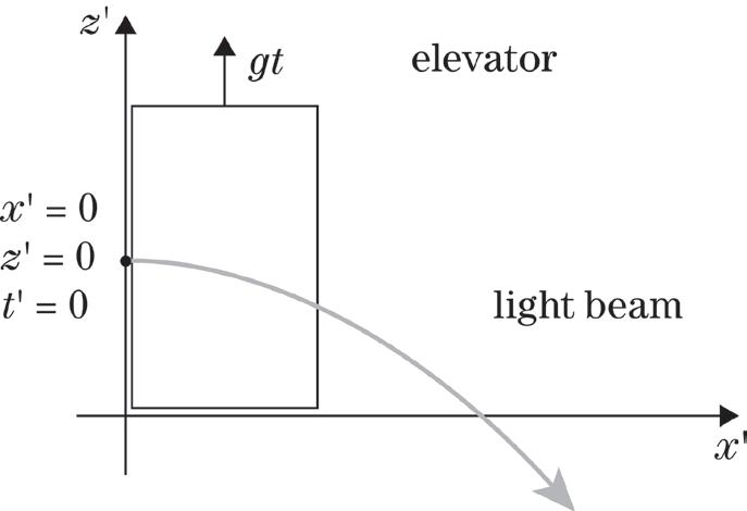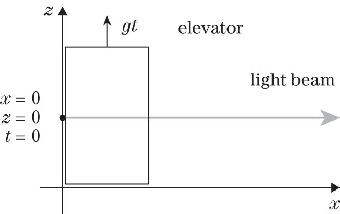 Let’simaginethat,at t =0,aflashlight(todaywemightusea laserpointer)emitsapulseoflightinahorizontaldirectionfrom theleftsideoftheelevator;seefigure5.Thelightthentravels acrosstotherightsidewiththeusualspeedoflight c.Since thestationaryframeisassumedtobeaninertialframe,thelight movesinastraightlineinthestationaryframe.