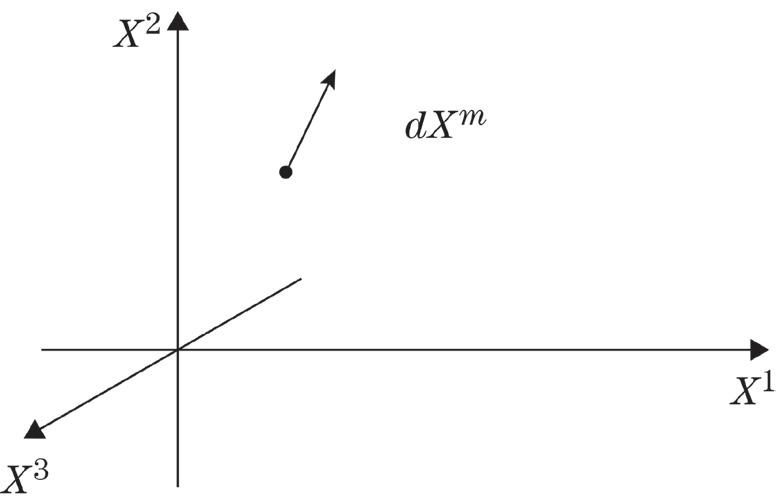 Welookattwopointsinaspace;seefigure11.Inourexample therearethreedimensions,thereforethreeaxes, X 1 , X 2 ,and X 3 . Therecouldbemore.Thusapointhasthreecoordinates,which wecanwriteas X m ,where m isunderstoodtorunfrom1to3 ortowhatevernumberofaxesthereis.Andalittleshiftbetween onepointandanothernearbyhasthreecomponents,whichcan bedenoted∆X m or,ifitistobecomeaninfinitesimal, dX m