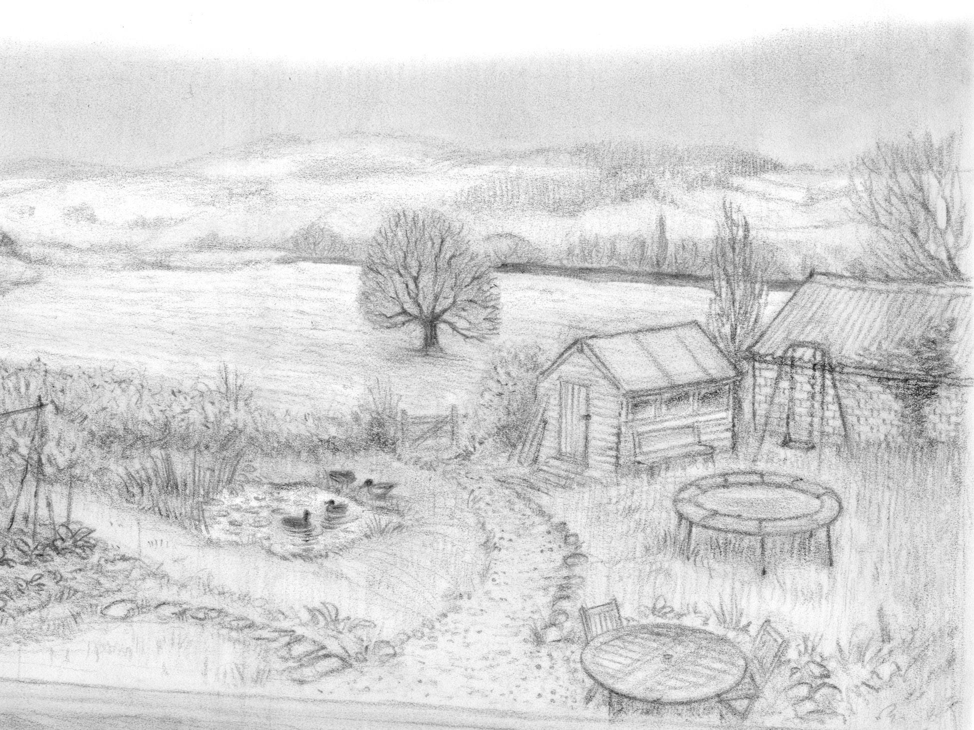 When James looked out of his bedroom window – which he did a lot because that’s where he did most of his dreaming – he could see his dad’s shed at the bottom of the garden, the weedy duck pond, his mum’s vegetable patch, the swing, and the trampoline that Grandma had given him the Christmas before. And beyond the garden hedge he could see