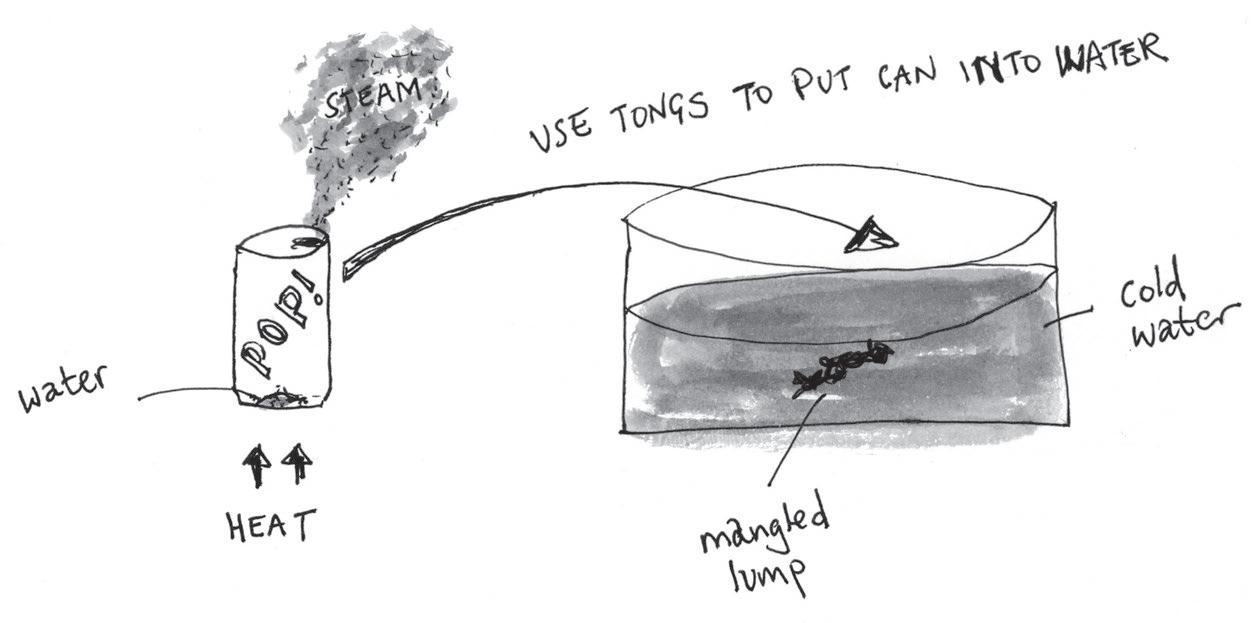 was an eighteenth-century innovation by a British Baptist preacher that provided the answer to the first question. His name was Thomas Newcomen and he found a way to make a machine that was driven not by clockwork but by a gas. The odd thing about steam is its ability to disappear on command and in doing so create an enormous force. You can see this for yourself by carrying out a simple experiment. Take an empty drinks can, put a small amount of water in it and then place it on a stove until the water inside starts to boil (youâll need tongs to hold the can, but itâs worth the hassle). This fills the can with steam that displaces the air. Now plunge the can into a basin of cold water. Immediately you witness something extraordinary and magical: the can crushes itself into a tightly mangled lump. It seems to be acted on by an invisible force. Harnessing this force was the key to the development of the steam engine. Others came before Thomas Newcomen to understand steam power, but he usually gets the credit