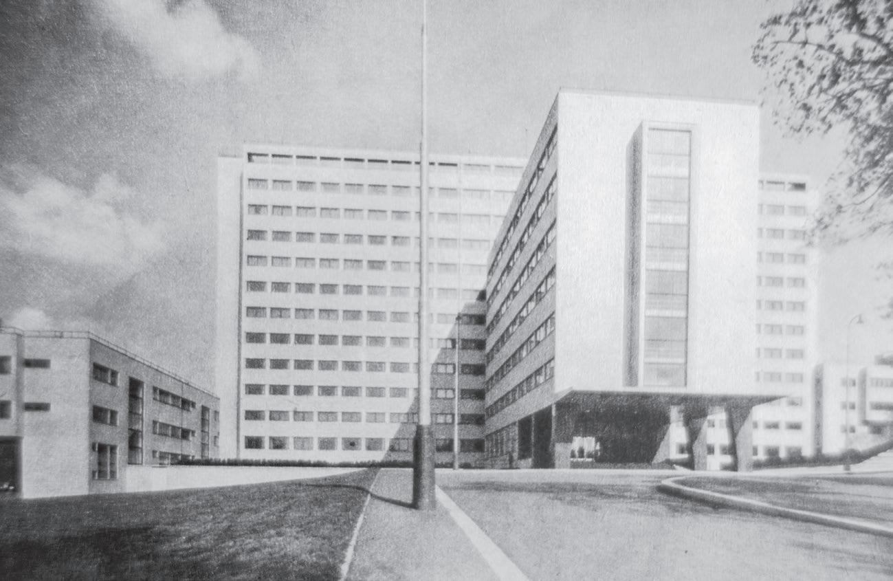 It’s telling that in designing this incredibly prominent building, Rosenberg employed another exile of the 1930s to design the public sculpture to stand at the heart of the public space opposite Parliament. Naum Gabo was born in the Russian provincial town of Bryansk in 1890 and educated in Moscow and St Petersburg; after the 1917 revolution, he became one of the first pioneers of the Constructivist movement with his Realistic Manifesto, written with his brother Antoine Pevsner. Gabo moved westwards across Europe as the interwar years went on; like Rosenberg, he was a Central-Eastern European Jew who had fled the rise of Nazism and come to London in the second half of the 1930s. He would not make his life there, unlike Rosenberg, but Gabo did live in Hampstead and St Ives for a decade between 1936 and 1946, and he had a huge effect in those ten years as a real, living emissary of the utopian fervour of the Soviet avant-garde, spurring on the courage of young sculptors and painters unsure how far they could take the break with the imperial consensus of their forebears. For Gabo, designing the sculpture for this NHS hospital was a gift, giving something back. In a note published as it was unveiled in 1976, he wrote of how he had ‘lived in England through the most tragic years of her history and the most glorious period in the life of her people . . . I never, in my heart, lost my attachment to England.’3 And here they both were, at St Thomas’s Hospital: Gabo and Rosenberg. These avant-garde experimenters managed to build their ideal right in the centre of the European capital that had once been the most hostile to their modernist ideology – although it had been comparatively forgiving, compared with the countries they had come from, as to their physical existence.