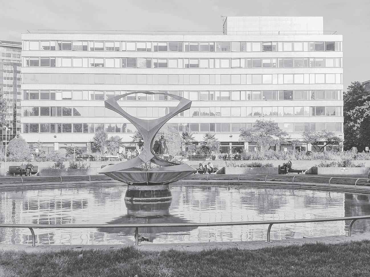 probably doesn’t like it, but he did not coin a particular epithet or insult to sum up his dislike. Rationality and order, St Thomas’s suggests, is normal, and – why not? – a little boring. It is the least you should expect. That, at least, is how you might see it on an average day. But this wasn’t an average day, and I wasn’t seeing things as I normally would. The experience of having a ferocious pain was suddenly salved, and given the time to linger – knowing I wouldn’t be going back to work – I did so. I remembered, from a library book about public sculpture in London, that somewhere near here was a work by the Russian Constructivist Naum Gabo, and after a short wander – the sculpture wasn’t signposted – I found it. It is in a sunken garden, on the Embankment. There is no building directly in front of it, so it is framed either by the insane spiked skyline of the Palace of Westminster over the river, or by the right angles of St Thomas’s lower blocks. The sculpture is a thin, organic, curved form at the centre of a fountain. It is called Revolving Torsion, and like many of Gabo’s sculptures it is ‘kinetic’ – that is, it moves and revolves, and water pours from it.1 The way the water emerges makes the metal form look like a series of membranes, like tendons pulled over bone. If you can’t quite see properly – and of course, on first seeing it, I couldn’t – you might find the effect slightly unnerving, and ask yourself whether or not you’re actually seeing what you’re seeing. That feeling is exciting. But when you look closely at the sculpture, you see that the effect of motion is perfectly rational, and you can see the game that’s being played. Gabo is sharing its rules with you.
