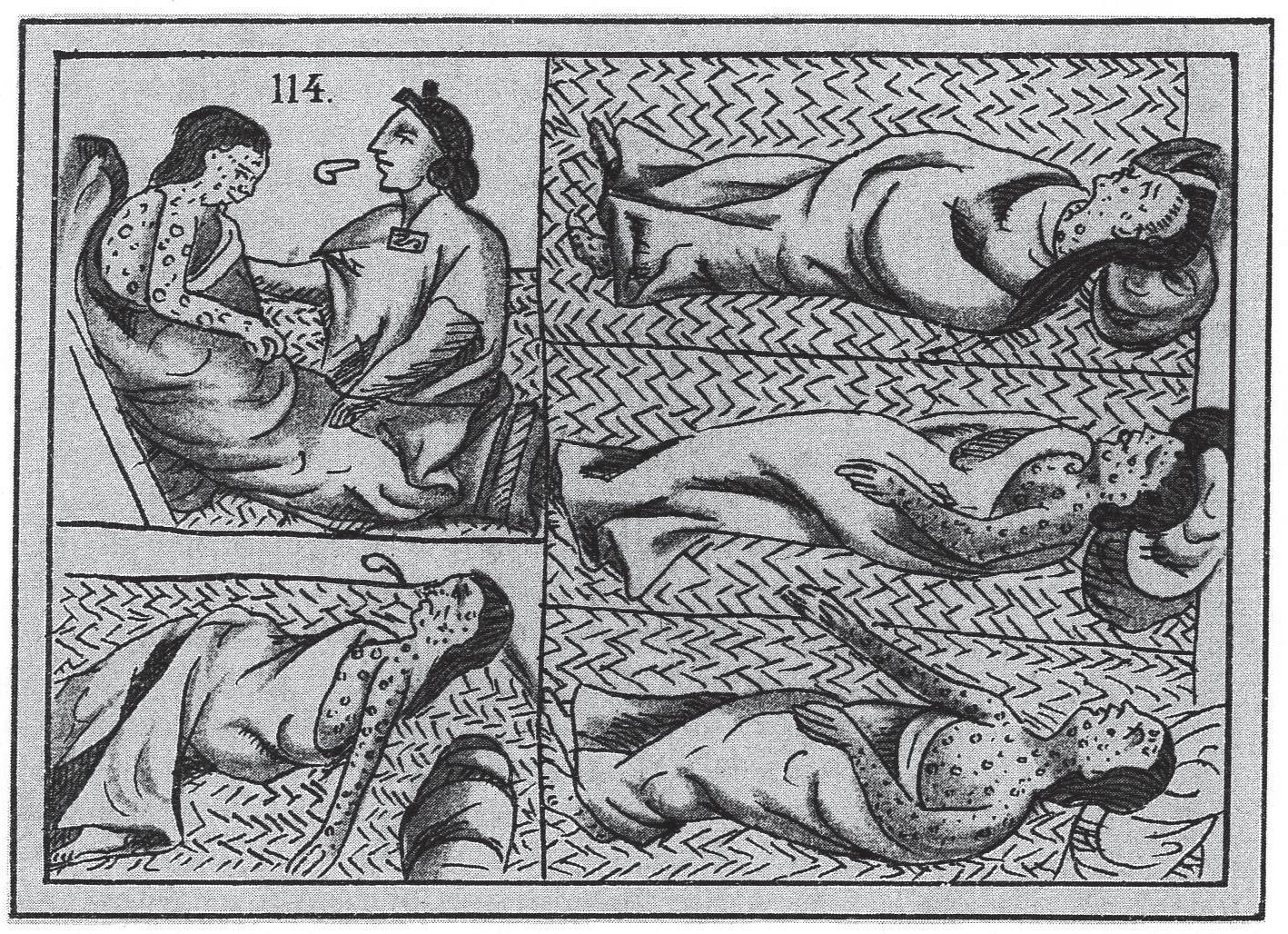 The virus was also a trickster, which increased its mobility: Symptoms only appeared twelve or so days after it was contracted, they were initially quite mild—headaches, fever, and nausea—and they often went away for a while. The infected, effectively asymptomatic, might not even realize they had the disease until they entered its second, often fatal phase. Lesions turned into pustules that spread across the skin and affected the internal organs as well. The body reacted with fever and shedding skin, opening a new front of vulnerability to other pathogens such as measles, what the Nahua called the “little plague” that followed the great one.32 After two weeks the pustules and blisters turned to scabs, in which the virus could survive for weeks, and which fell off to infect others. Indians were three times as likely to die from smallpox as Europeans were. 33 The first epidemic began in September 1520 and lasted for years; it killed, survivors remembered, “infinite numbers.” 34