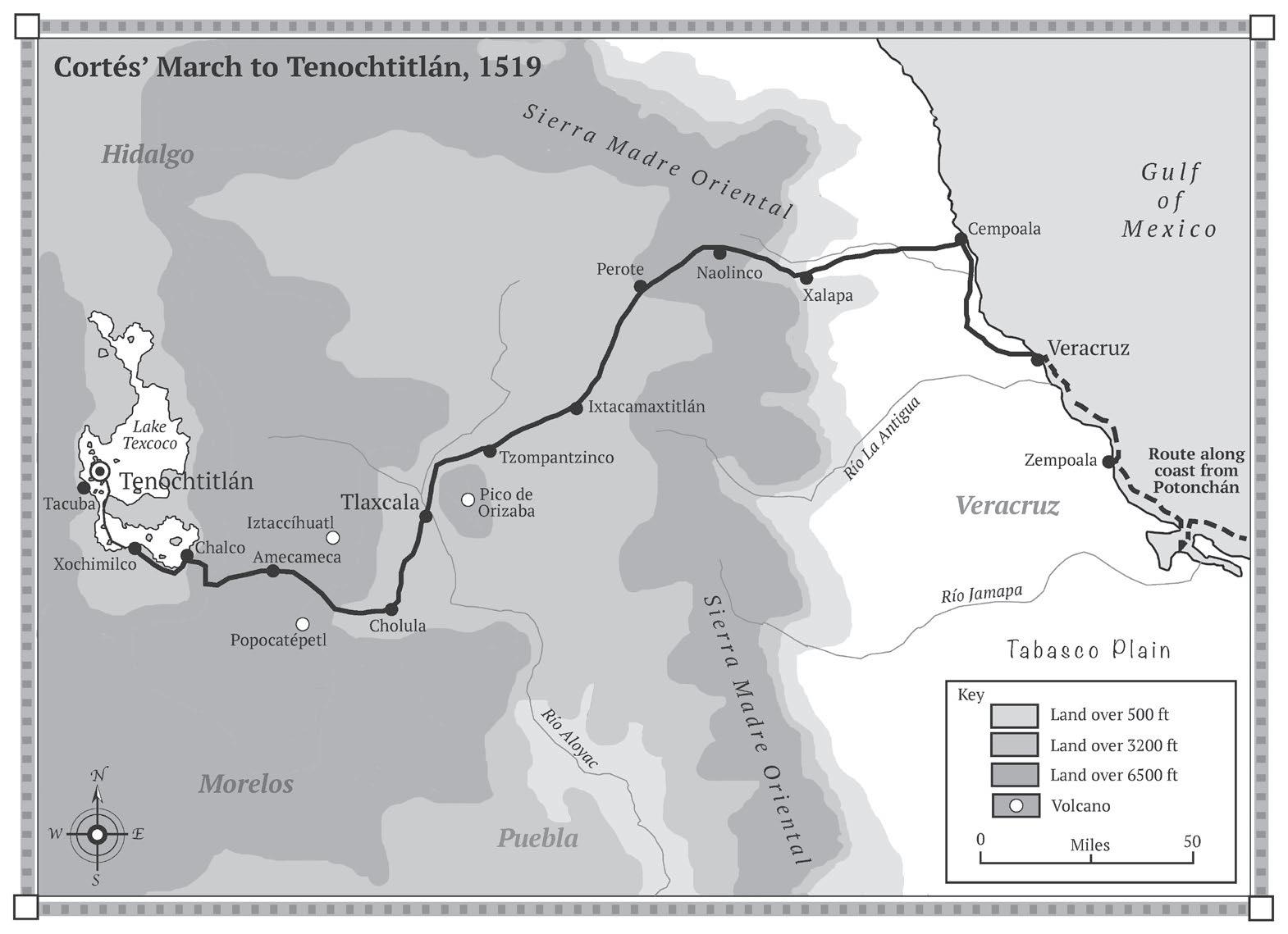 Most important of all, the earlier contacts provided him with his critical first interpreter, the bilingual Spaniard Aguilar. He could translate Spanish into Maya; Malintzin could translate that Maya into Nahuatl; and Cortés, consequently, could from the very start communicate with the people he planned to overpower. These linguistic and cultural tools in hand, Cortés wielded them with distinctive guile to manage his own first contacts with the indigenous world. He worked hard to charm and terrify the Indians, encouraging them to believe that both his guns and his horses were hostile living beings, controlled by his goodwill alone. In April 1519, he moved up the coast to central Mexico, where he founded the Villa Rica de la Vera Cruz, the Rich Town of the True Cross, later just Veracruz; established good relations with the local people, the Cempoalans; and sent messengers directly to Spain to ask for the royal appointment that would establish his independence from Governor Velázquez in Cuba, entitling him to the leader’s share of any profits. He also received the first messengers from the Mexica capital, Tenochtitlán, and began planning his march there. Finally, he rounded off his coup by beaching and derigging—not burning—his boats, making hasty retreat to the Caribbean islands impossible, and so encouraging his faction-ridden expedition to follow him up into the highlands.18