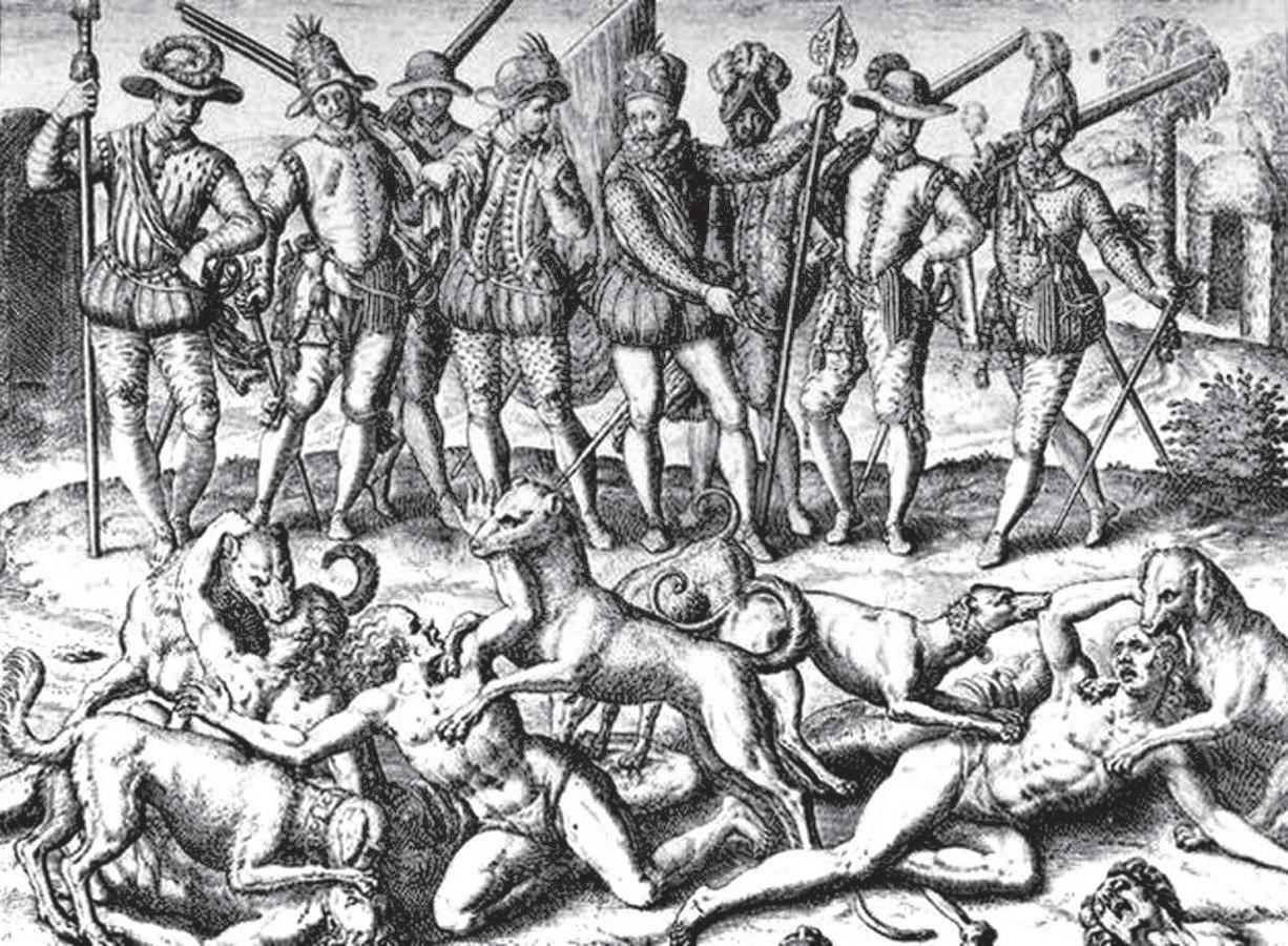 Aperreamiento (the method of execution by throwing to the dogs) as depicted in a Protestant propaganda woodcut. Theodor de Bry, Brevísima Relación de la Destrucción de las Indias (1598).
