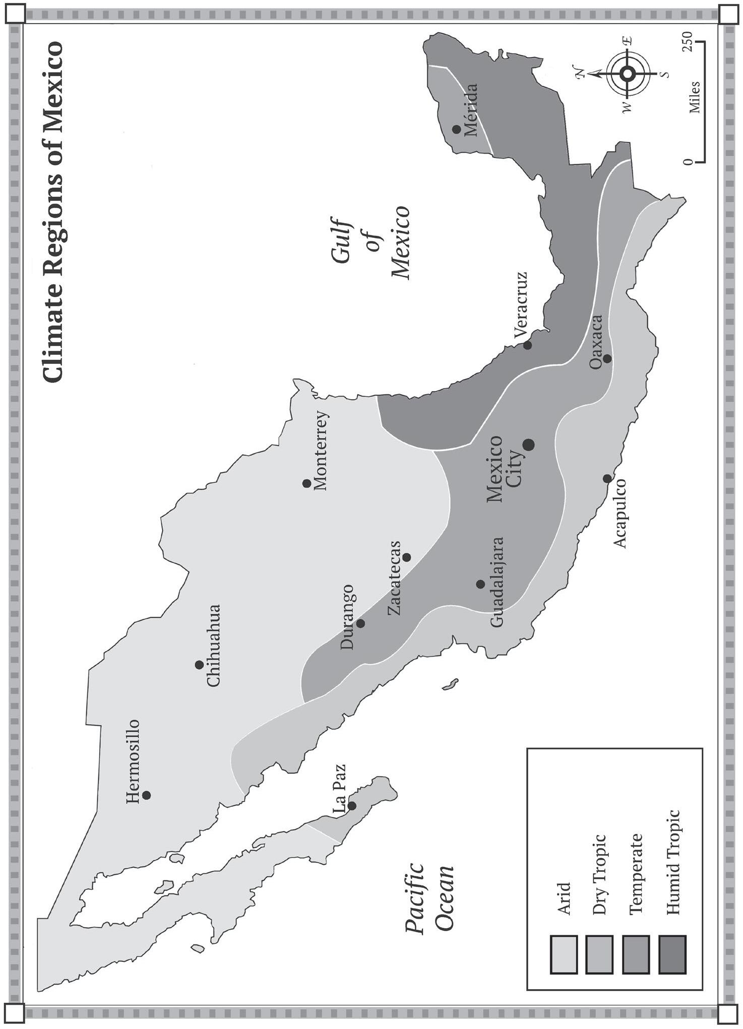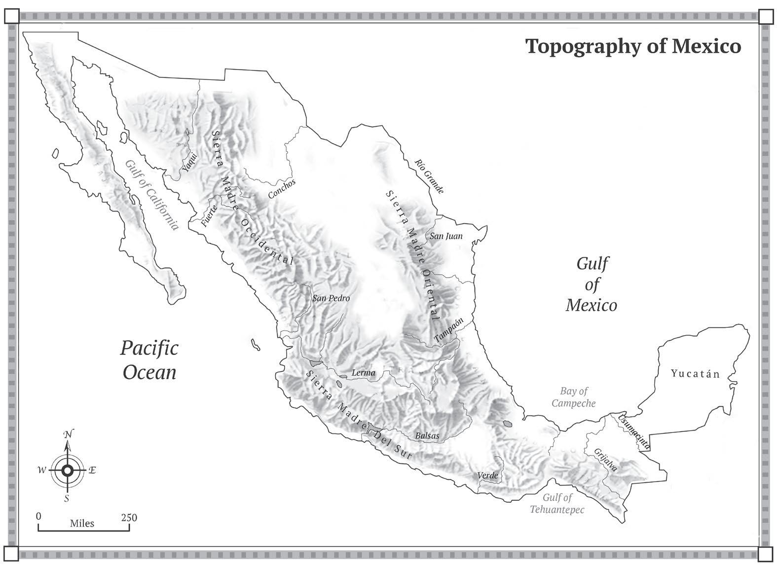 The land that ended up being Mexico stretched for over a thousand miles on either side of the Tropic of Cancer, passing through seven climate zones, and climbing from the shores of a sea and two oceans up to peaks of eighteen thousand feet in the volcanic highlands. In the far Northwest, beyond Spanish colonization for centuries to come, a pocket of Mediterranean-like weather gave way to hot desert surrounding the Sea of Cortés. Moving east, the land rose into the Sierra Madre, the geological continuation of the long spine of the Rockies, where temperatures fell and rain returned, bringing with it the forestlands of pine, juniper, and oak of Sonora, Sinaloa, Durango, and western Chihuahua. On the other side of the watershed the land fell off and the rain ran out and the climate became arid or desert all the way to the Gulf Coast, grasslands giving way to mesquite and cactus. Moving southward across the Tropic, the coasts turned to savanna with a band of monsoon wetlands in Tabasco and Campeche and a swathe of rainforest that stretched from the Isthmus of Tehuantepec down into Central America. In the center the land rose over seven thousand feet into a cold, semi-arid plateau, the altiplano, punctuated by the watery Valley of Mexico, before descending again into the subtropical highlands of Morelos.