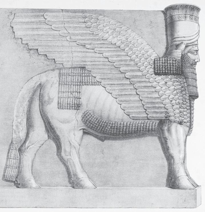 Most of the lamassus in the palace have ve legs, so that when viewed from the front they appear to be standing rm, but seen sideways they are stomping forward, ready to trample on even the most fearsome adversary. In this state, they can both confront unwanted visitors and ward o any evil lurking in the shadows. Though he has not told this to anyone, the king feels safer and more at ease with them around, and that is why he has recently commissioned artists to chisel a dozen more sculptures. One can never have too much protection.