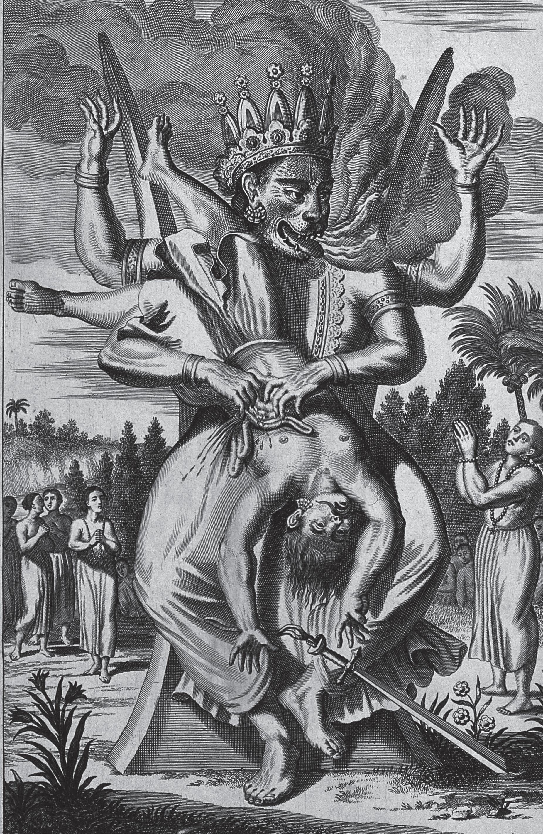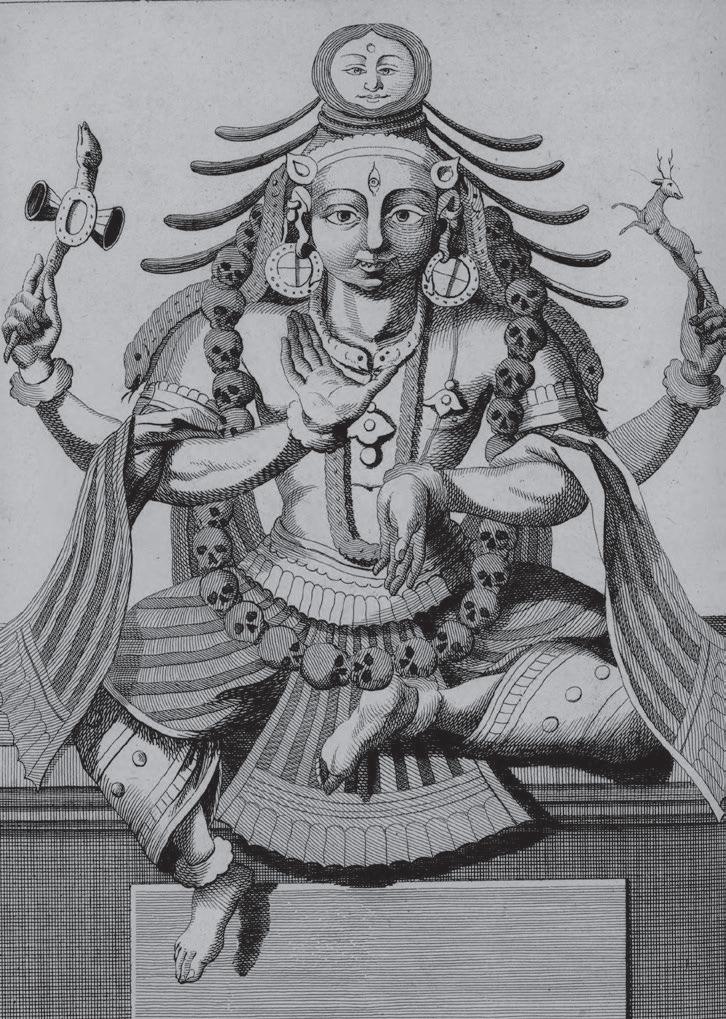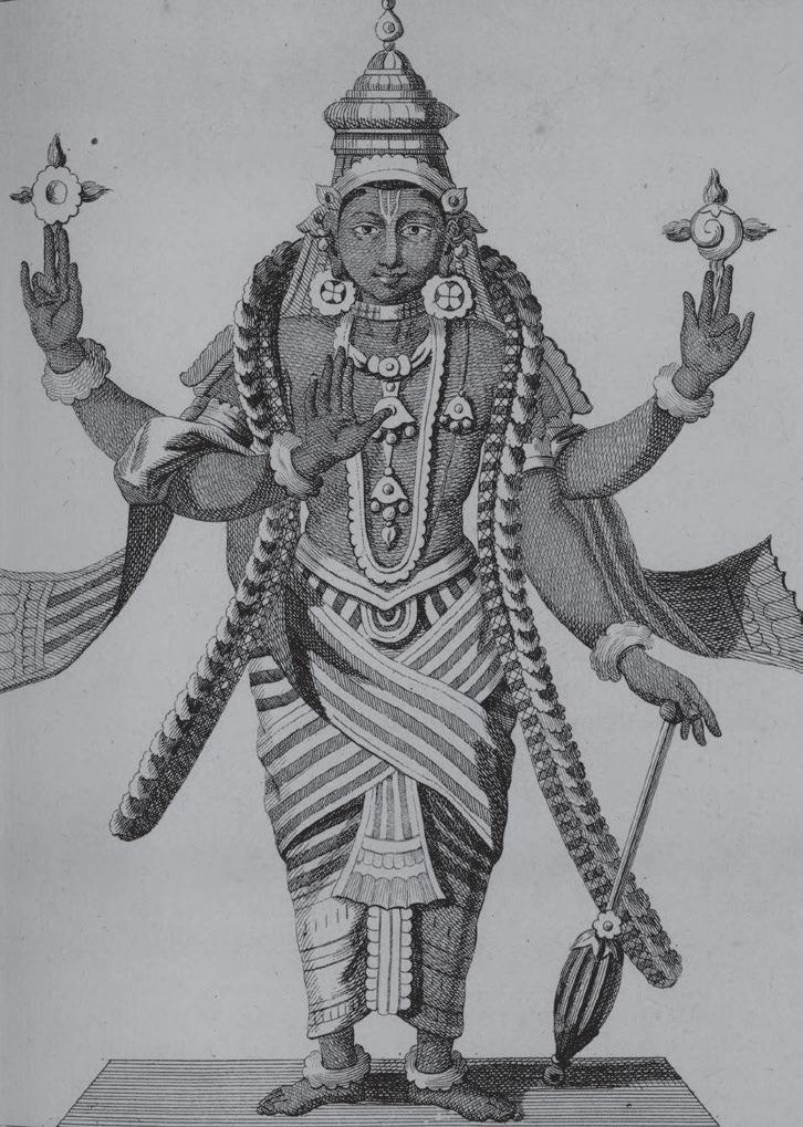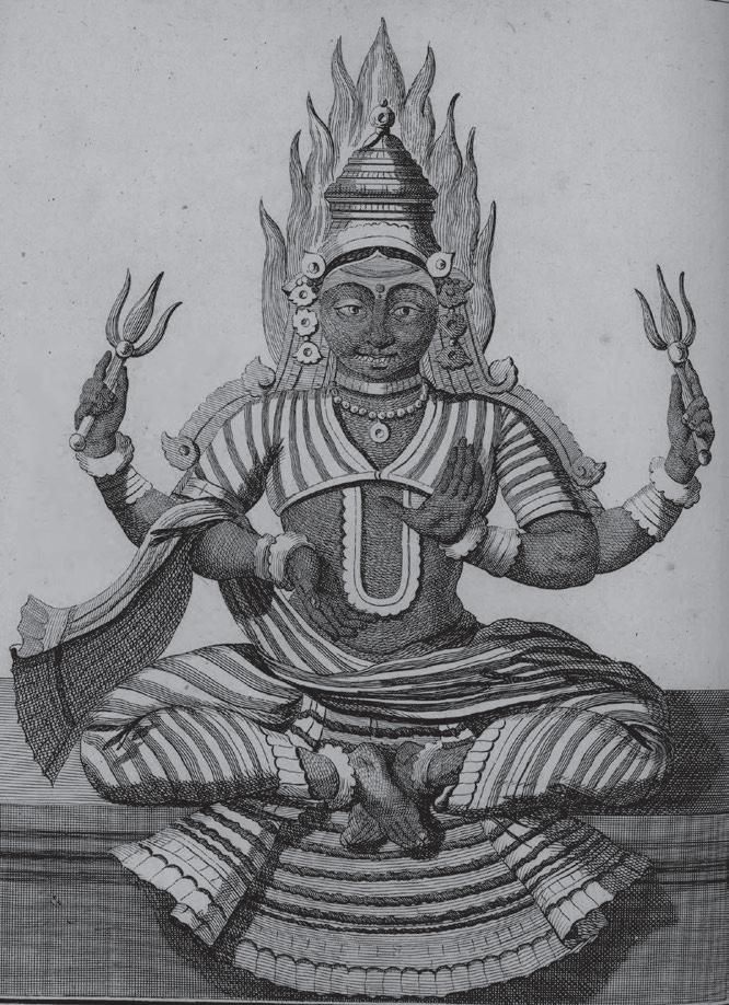 by the time the Dutchman Jan Huyghen van Linschoten joined Portuguese service in Goa in the year of Acquaviva’s death, it was normal to describe gods in temples as demons. Or as the man wrote, Hindu shrines housed ‘Idoles’ that were ‘cut most ugly, and like monstrous Devils’. Indeed, the devil spoke through these images, which was why Hindus venerated him and made offerings: ‘to keepe friendshippe’ and ensure ‘hee should not hurt them’. Their religion, in other words, was not about finding the light as much as cowing to darkness—the opposite of Christianity.46 Once van Linschoten passed by some villages and ‘at everie hil, stonie Rocke or hole’ there was a ‘Carved Pagode, or rather Devils, and monsters in hellish shapes’. An image he saw on this journey was ‘so mishaped and deformed’ that that it surpassed all the ugliness so far suffered— the deity (probably Narasimha, the man-lion form of Vishnu) had ‘hornes, and long teeth that hung out of his mouth, down to the knees, and beneath his Navel and belly it had an other such like face, with . . . tuskes’. There was on its head something ‘not unlike the Popes triple crown’ so that ‘in effect it seemed to be a monster [of the] Apocalips’.47 No matter which way he looked, van Linschoten saw in Hindu gods the very creatures Christian mythology warned the faithful to beware. To Indians, of course, these images were ‘visual theologies’ and ‘visual scriptures’,48 but, made of black stone and housed in dark sanctums, outsiders conjured up unpleasant associations.