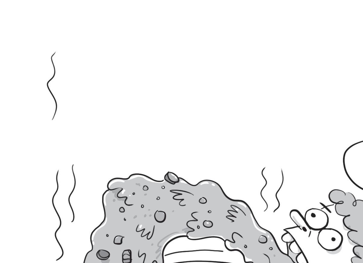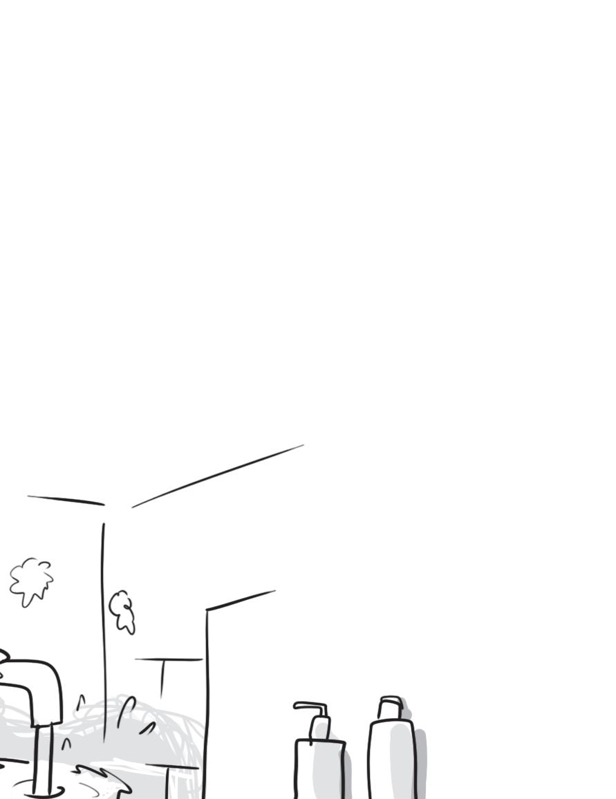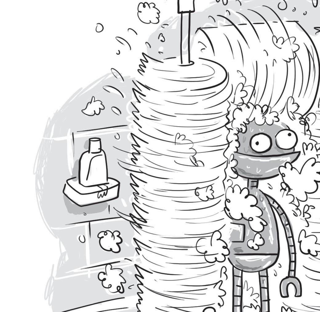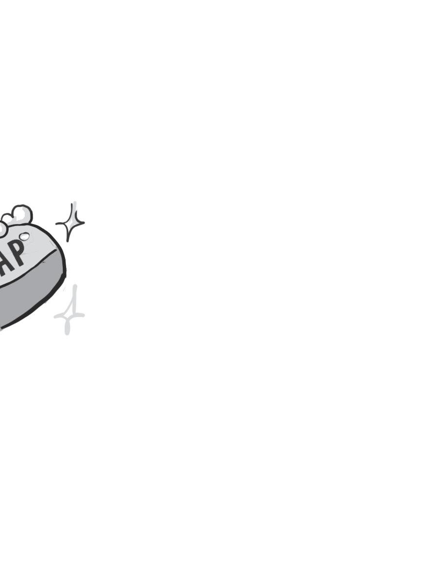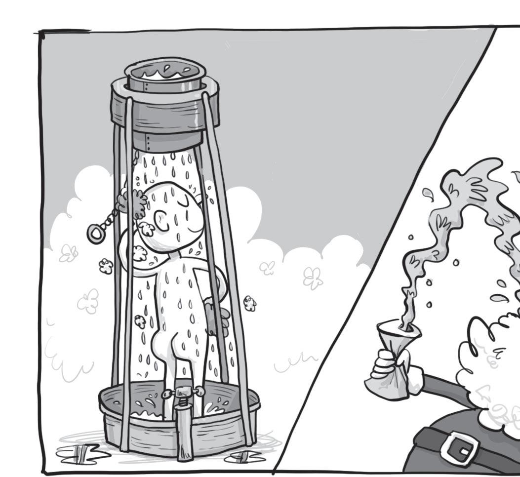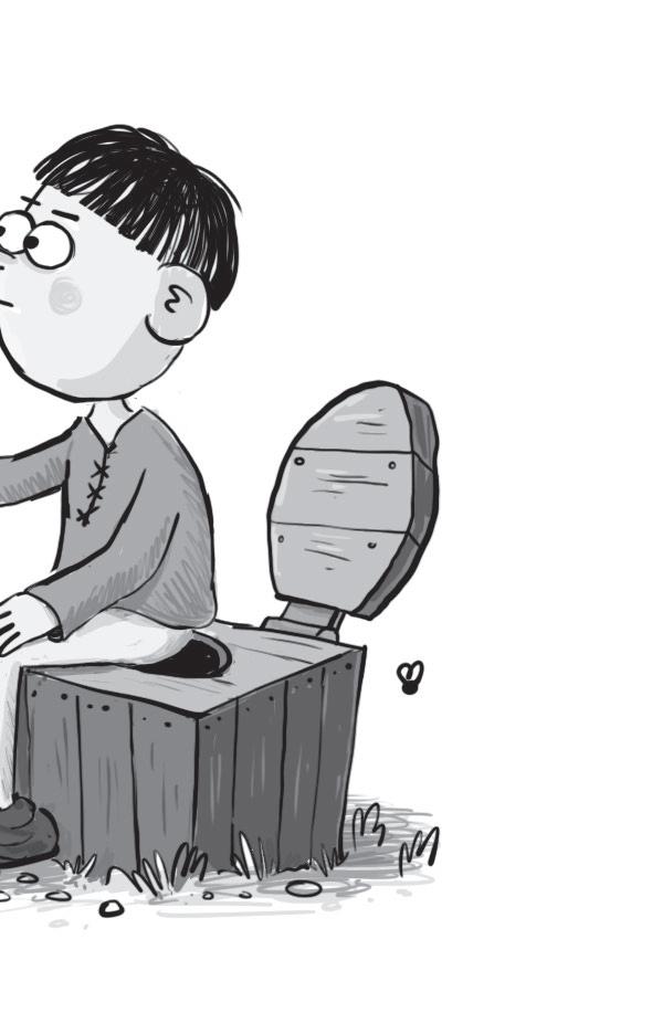 Until one hundred and fi fty years ago, houses didn’t have bathrooms. You basically had three options. Option one: go to a public bathhouse, which was like a big naked swimming pool with soap and sponges. Option two: keep a metal bath in your garden, and once a week carry it inside, put it next to the fi re and fi ll it up with loads of buckets of water that you’ve heated up. Because this was a massive faff, everyone would take turns using the bath one after the other, from the oldest member of the family to the youngest. So you’d better hope that Grandpa doesn’t like weeing in the bath. By the time the youngest person got into their disgusting weekly bath, the water would be so brown and murky that they couldn’t even see their own toes. Option number three was to just stay stinky. This is Pippin’s preferred method. Fact check – and yours.