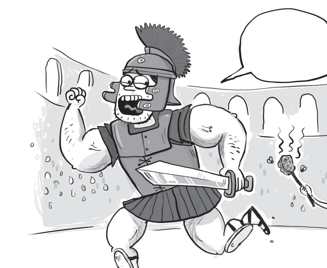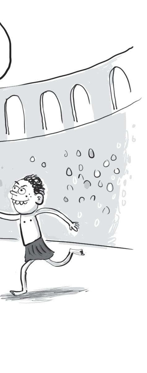that. So what was everyone using until then? Well, after the Ancient Romans had fi nished sitting on their big long toilet benches chatting to each other, they would grab a sponge on a stick and clean themselves up. And then the next person would take the same sponge on a stick and use it. And so would the next person . . . and the next person . . . Now is probably a good time to let out an enormous sigh of relief that you don’t live in Ancient Rome.