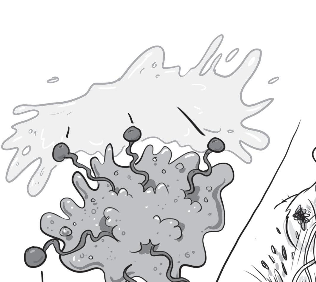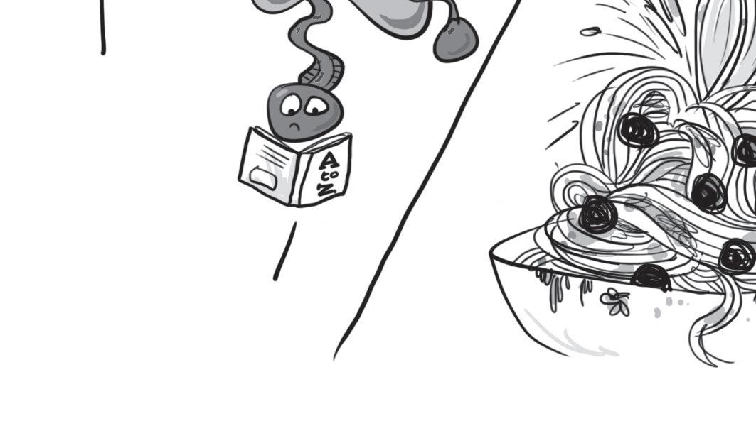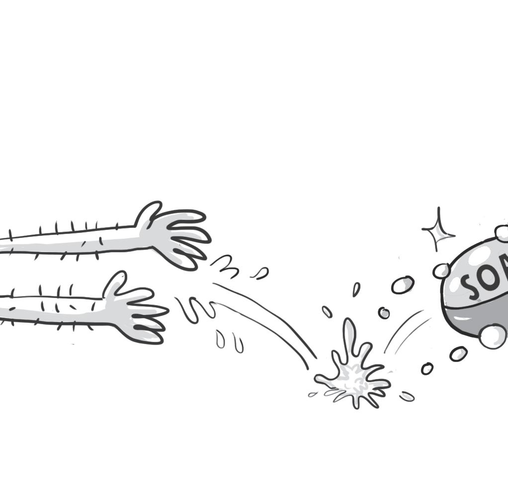 People have been making soap for about five thousand years. I think my Great Aunt Prunella still has some of that original stuff in her bathroom. Early soaps were made out of a mixture of animal fat and ash, which sounds like it would get you even dirtier. Early soups were made out of leek and potato. If you took a microscope and peered at a molecule of soap, you’d see that it looks a bit like a tadpole – one end of it loves water and the other end of it loves oil. Germs and dirt get mixed in with the natural oils on your skin, and when you put soap on, the oil-loving bit joins to it. And then, when you wash your hands, the water-loving bit of soap jumps over to the water, taking the germs and grease and gunk with it. Here’s another diagram, and an alternative picture of a yeti eating spaghetti.