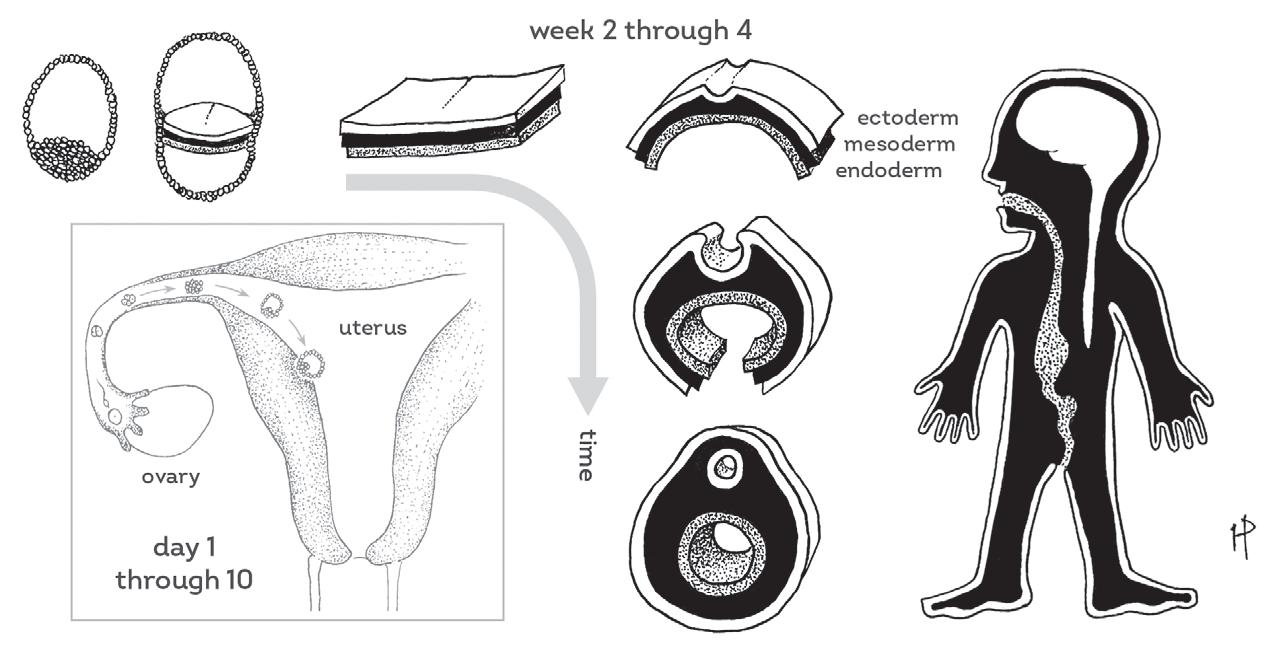 Figure 1.1 Early embryo development. Fertilization occurs in the fallopian tube, near the ovary. The embryo then divides repeatedly as it drifts toward the uterus, eventually implanting in the uterine wall around day nine. The clump of cells within the early embryo organizes itself into three distinct layers, the ectoderm (white), mesoderm (black), and endoderm (gray). This three-layer sandwich folds to form the gut tube, which will develop into the digestive tract and lungs. The ectoderm forms the neural tube, which will develop into the brain and spinal cord. As a result, your skin, brain, and spinal cord develop from the ectoderm layer, your digestive tract and lungs from the endoderm, and your muscles, bones, and most other tissues from the mesoderm.