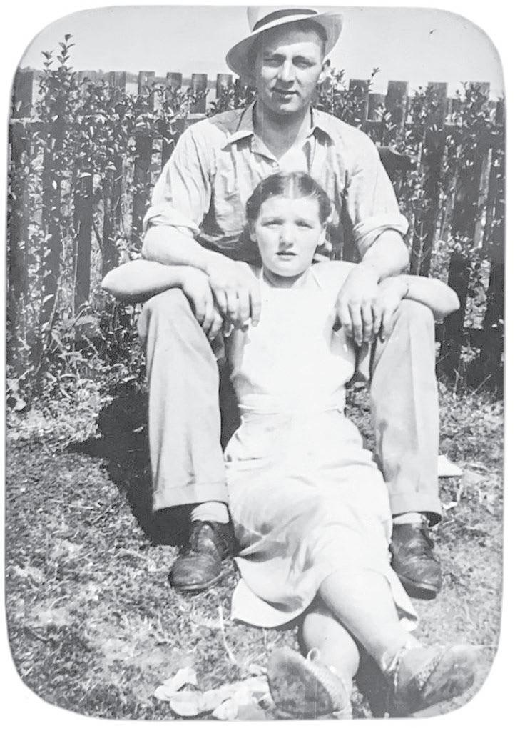 Young Flo White longed to escape this sordid world. She had already left Rawmarsh, was holding down a job at Peglers and lived in an end-of-terrace house in Balby. To progress further, she needed to marry. Ralph, the policeman from Mexborough, was not only six feet tall, give or take, used long words and had dreamy blue eyes, but came from a working-class family a shade more respectable than her own. To her, he was the perfect gentleman. She accepted his proposal, nudging her mother a step closer to leaving James Arthur. Now engaged, Ralph and Flo spent more time alone, albeit in public. Ralph owned a camera, and they took it with them on walks. It may have been Flo who snapped Ralph in his Sunday best, trying to smile, somewhere in the countryside or in a park. The photo is undated and the context is gone. But Pauline had another from this time, one that held my gaze much longer. Ralph sits in front of a picket fence, Flo on the grass between his knees, legs crossed at the