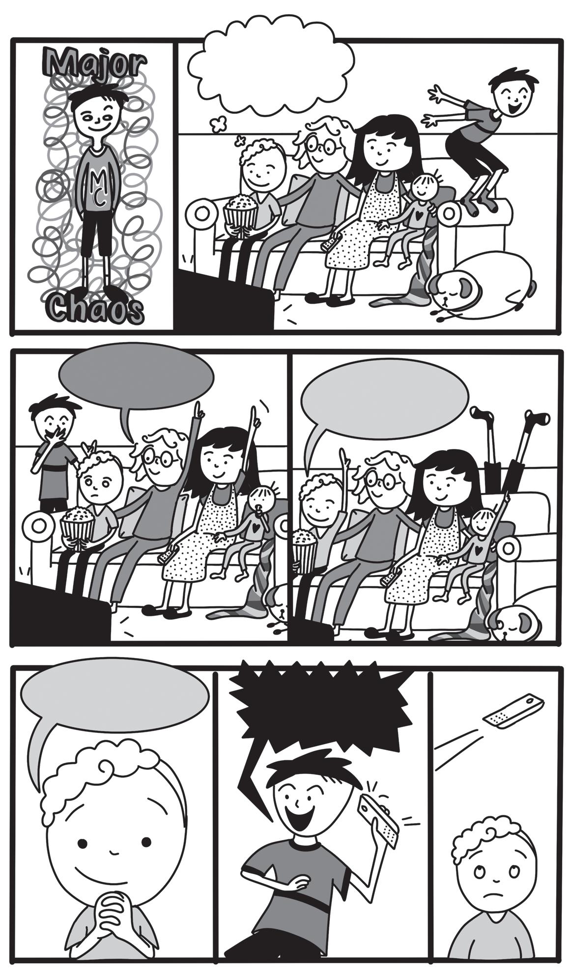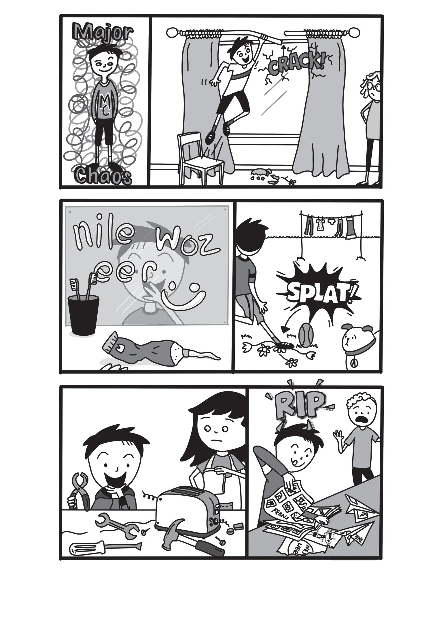 Oblivious to my despair, Nile bounces around the room like Tigger at a tea party. ‘Epic or what, Ferris?!’ he shouts, as he watches his recording back. I gaze around the kitchen and shake my head. Most of the cupboards are ajar, and there’s STUFF on every surface: scissors, string, empty Mentos packets, cutlery, discarded funnels and pans, muffin cases, toothpaste, vinegar, baking soda