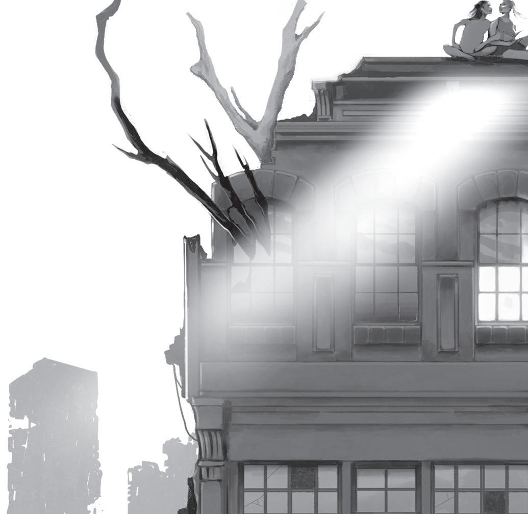 Well-meaning adults would ask, “Now, where do you want to go to college?” or “What are you planning to major in?” and I’d just smile and say, “I have a couple of top choices” or “I’m deciding between English, music, and biochemistry.” They’d nod and reply with “That’s nice,” and I’d die inside a little bit. I hated not knowing what I wanted and knowing that I’d have to figure it out sooner rather than later. I had a future, but I didn’t want one. Now I miss the future I never had. Joni Mitchell would have a field day with my predicament. I look back toward the leaning tree and stare at its dead limbs. Not a single green leaf clings onto its branches. It’s been dead and gone for a long time, and I didn’t even notice— though I suppose it’s easy to miss when the streets are covered in bits of buildings and the shops you used to visit on Fridays after school are half reduced to ruins. My world has crumbled around me, and I’m still trying to hold together the pieces that are left.