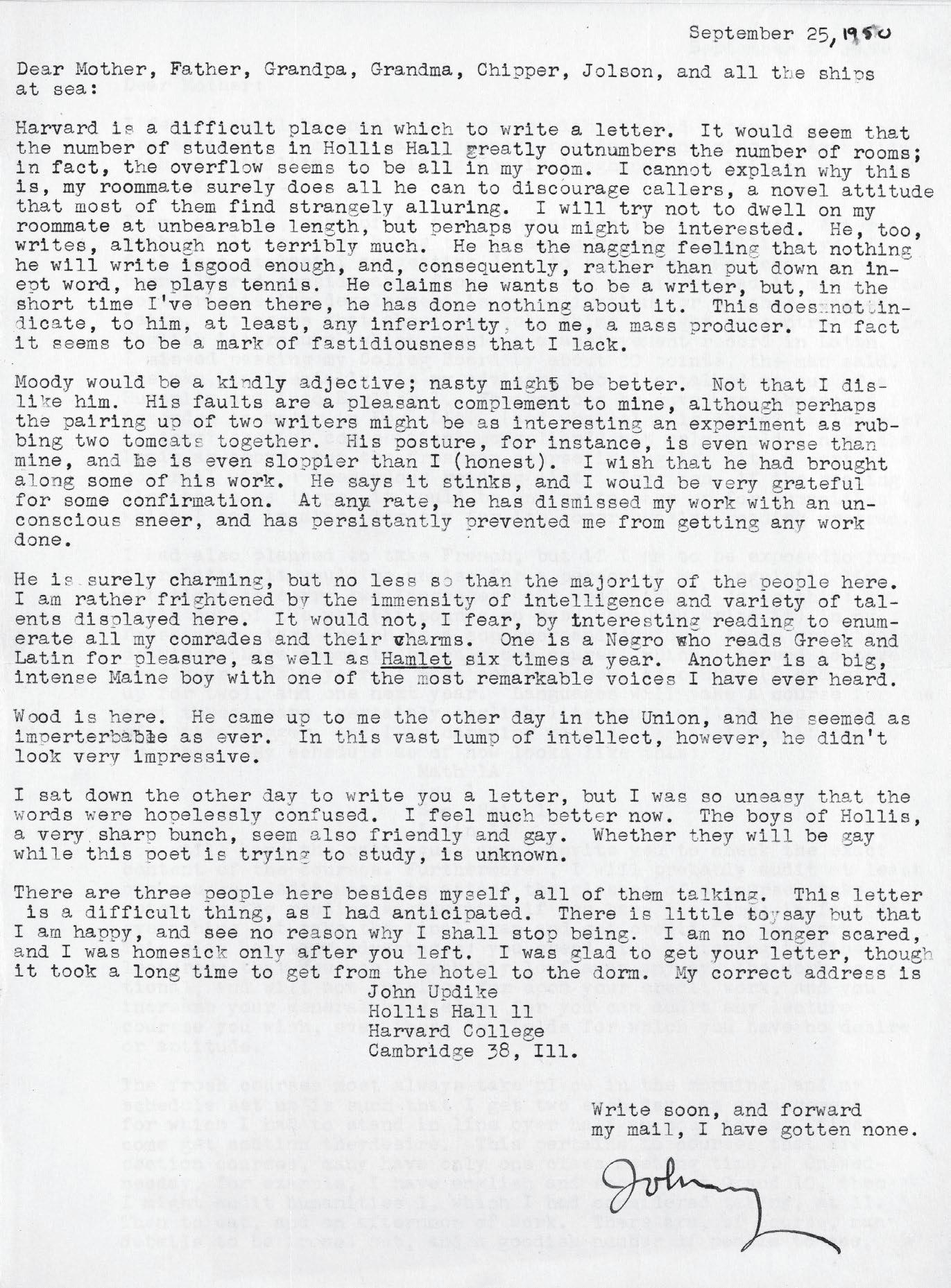 It’s hard to overstate the importance of his family during those early years, and it didn’t stop when he enrolled at Harvard. Within a few days after his arrival at Hollis Hall, his freshman dormitory, Updike became aware, if he hadn’t already anticipated it, that his primary correspondent, his verbal volleying partner, would be his mother. During a busy first year in which he studied hard, submitted writing and artwork to The Harvard Lampoon, and sought to assimilate into an unfamiliar and privileged environment, Updike composed fifty-four substantive letters to his family. Commonly addressed “Dear Plowvillians,” these letters were read not only by the four residents of the sandstone farmhouse but also by neighbors, friends, and relatives. They became a source of entertainment and were often reread; as his mother revealed, “We all read your letters six, or is it sixty, times.” Further, the letters were not the crabbed, laconic, dashed-off notes often composed by college students of that era to ask for money. Filled with news and observations,