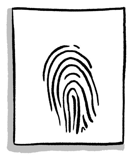perfect fingerprint on the glass. Taking care not to smudge it, you place a piece of sticky tape over the print, then peel it off to make a record of it.
