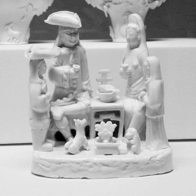 I left my spotlit Moor where he was – patiently holding his tray of gems, awaiting the fresh pity and ready-made critique of another busload of European tourists – and walked on. Onwards, into the second room, where I spotted an object that stopped me in my tracks. It was far less spectacular than the Chinese heads or the Moor, and sat half-ignored under Perspex, poorly illuminated, easily missed. Just a little piece of Chinese porcelain called European Family – but it made me laugh out loud. I couldn’t help but think of the Chinese artist who had made it. Was it a commission or simple curiosity that had led him to his subject? Had he* ever seen a European family? Perhaps he had seen the many portraits of them and wondered at