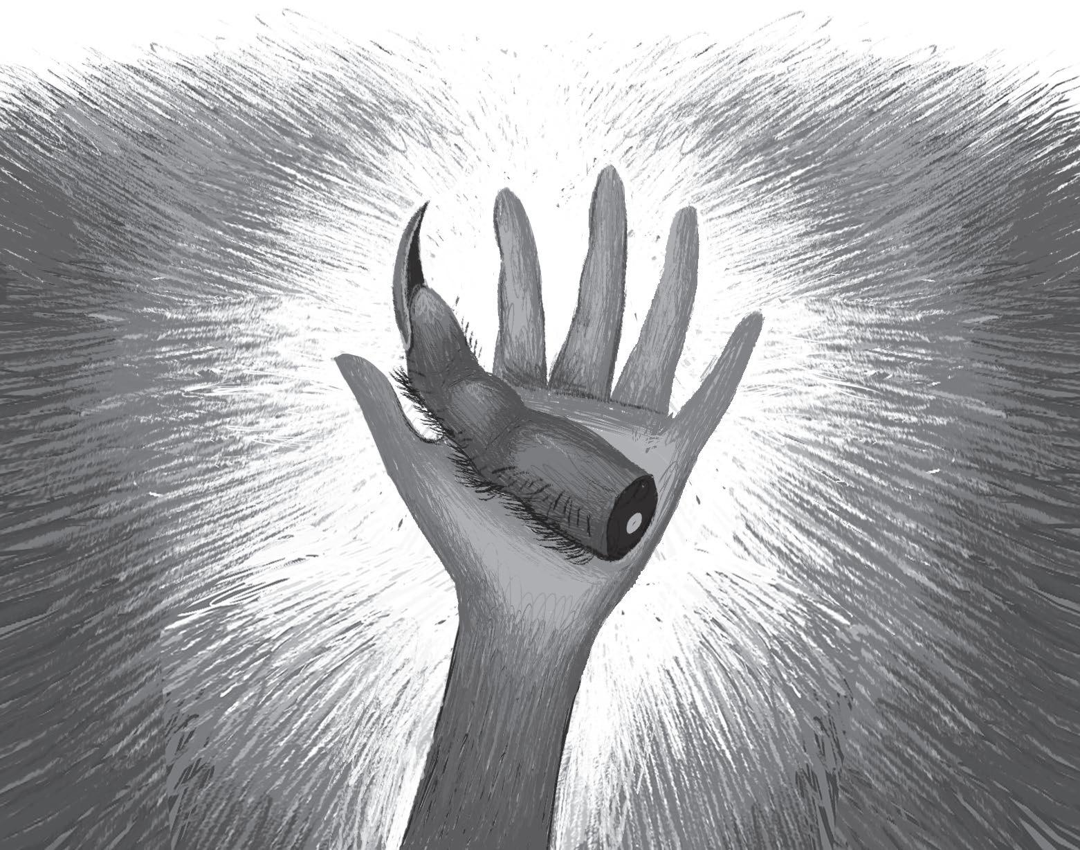 My hand was shaking violently, partly from fear, partly from the thing trying to escape from my grasp. Slowly, I opened my palm. There, writhing about like a furious fish, was a green severed finger! Its nail was sharpened to a point and decorated with silver polish, old and chipped.
