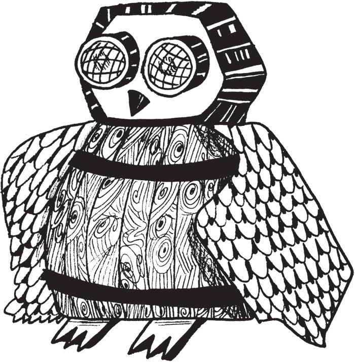 It was the afternoon now and Evnie was tinkering with a work in progress that had kept her occupied for the last two years: a mechanical owl. The owl’s head was made of an old clock. The workings of the clock had been altered and Evnie now considered them to be the owl’s brain. Each time she opened up the owl’s chest to work on the complicated gadgetry within, she was greeted with the warm scent of fruit and cinnamon: his body was an oak barrel which had once