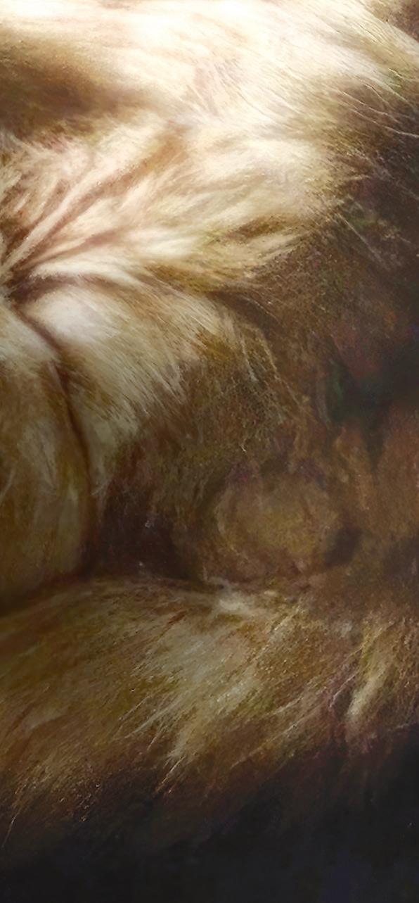Up close, her big, brave stare took on an air of searching insistence, which only made it more expressive. Indeed, it was one of the most communicative gazes I’d ever seen in a cat, a look facilitated by the structure of her face: the eyes were oriented fully forward, like a big cat’s rather than a domestic’s, and seemed to comprehend everything she was studying — especially me — only too well. When she held her face right to the cage door, I could see that her muzzle was frosted white at the nose and chin and oriented downward more than the outward of most mixed breeds, allowing her even greater range of vision. On either side of her head she had tufts of fur extending out and down, like the mane of a lynx or a young lion; and these led to and blended in with an unusually thick and impressive “scru ,” that collar of vestigial extra skin around a cat’s neck that their mothers use to lift them when they are kittens (and that some humans, even some veterinary assistants, mistakenly believe they can grab to control and even lift a grown cat harmlessly, when in fact cats nd it uncomfortable and cause, sometimes, for retaliation). Finally, exceptionally long white whiskers descended in two arced, rich clusters from the white of the muzzle, increasing the e ect of the kind of active wisdom present in big cats, as did the animated ears, each turning and twisting on its own at every sound.
