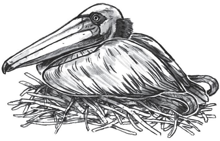 Mother bird, Ivorombe, was a large and unusual bird. She had an orange-red bill that weaved through trees like a flashing light when she passed through a forest. She had white tail streamers that drew loops as she flew, and a streak of pink on her back. Her eyes were particularly striking, with black eye patches over her white feathers that made it look like she was wearing spectacles. Her bill wasn’t just colourful, it was big, with a large bottom for storing food and other useful things – a bit like a pelican’s bill. In fact, Ivorombe is the grandmother of herons and tropicbirds and pelicans.