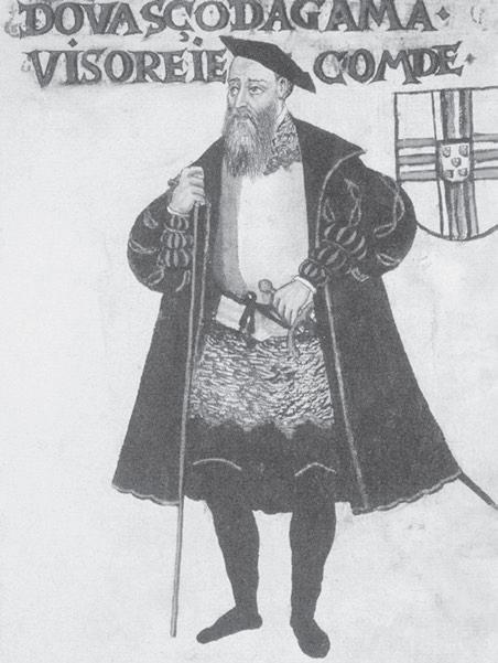 To explain away this blank space in Da Gama’s backstory, some historians have advanced the imaginative theory of Double- O-DaGama, suggesting he was a sailor-spy who had led secret reconnaissance missions down the coast of Africa prior to his breakthrough voyage, missions so top secret that they have left no archival trace. This fanciful theory tells us less about Da Gama himself than about how uncomfortable historians can find holes like this in the records and what fantasies they have concocted to plug them. A portrait of him from close to the end of his life and a quarter of a century after his first voyage to India, shows a tired-looking man in his fifties clutching a staff and gazing quizzically, perhaps even anxiously, into the distance.