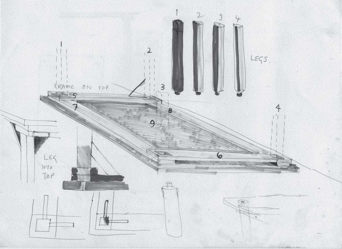 I decided I was going to do it with no nails, just with glue. I drew the thing, got my little sketches of how wide it was to be and how the legs were going to fit in. When I’d been in school, at the Liverpool Institute, we had woodwork classes, which a lot of us guys liked. I remembered a couple things, how to make a dovetail joint. I thought, ‘I know how to do that.’ Over the next couple of months, I went into town and got myself a chisel and a hammer. So, I had the whole structure, but it was still planks of wood, sitting in the corner of the kitchen. I didn’t dare try and put it together. But I bought some woodworking glue, Evo-Stik, supposed to be adhesive strong. And the table’s still standing. It was Evo-Stik glue. One night, I just plucked up the courage and thought, ‘Here we go.’ Right at the end, under the table, there was a cross-truss that had to fit in. And I suddenly thought, ‘Oh my God, it doesn’t fit.’ But somehow I wangled it. I turned it upside down and then it fitted. I have an idea of how to do a thing, and then enough passion to follow it through.