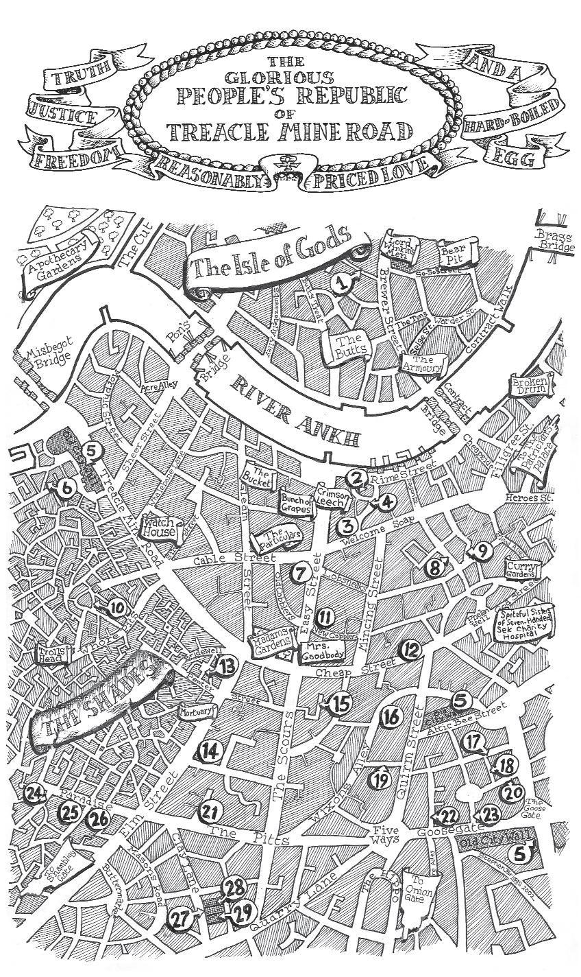 placid suburbs and its labyrinths and its warrens of crime and punishment, is recognizably a version of Victorian London, the city of Henry Mayhew and (especially) of Charles Dickens, of Holmes and Watson – but also of Conrad’s The Secret Agent. The city, too, of H. G. Wells’s The Time Machine, a novella of nightmare visions of London: the time machine itself (a kind of bicycle – a contraption which would sit well in the pages of Pratchett’s world) travels through vast gulfs of time, but stays completely still in space, never moving from its location in the prosperous London suburb of Richmond-on-Thames. Ankh-Morpork’s Victorian manifestation is broad enough, however, also to accommodate Night Watch ’s recurring intertextual engagement with Victor Hugo’s sweeping epic of power and poverty, crime and corruption, Les Misérables. Both feature a policeman, a criminal, bread theft, rescue by a prostitute, street urchin(s), the policeman taking to the bar ricades and blouse-wearing revolutionaries. (Only one of the books, however, has time travellers and clandestine monks in it.) There’s something characteristically Pratchettian in this borrowing of a work so self-consciously monumental and serious for his own comic aims.