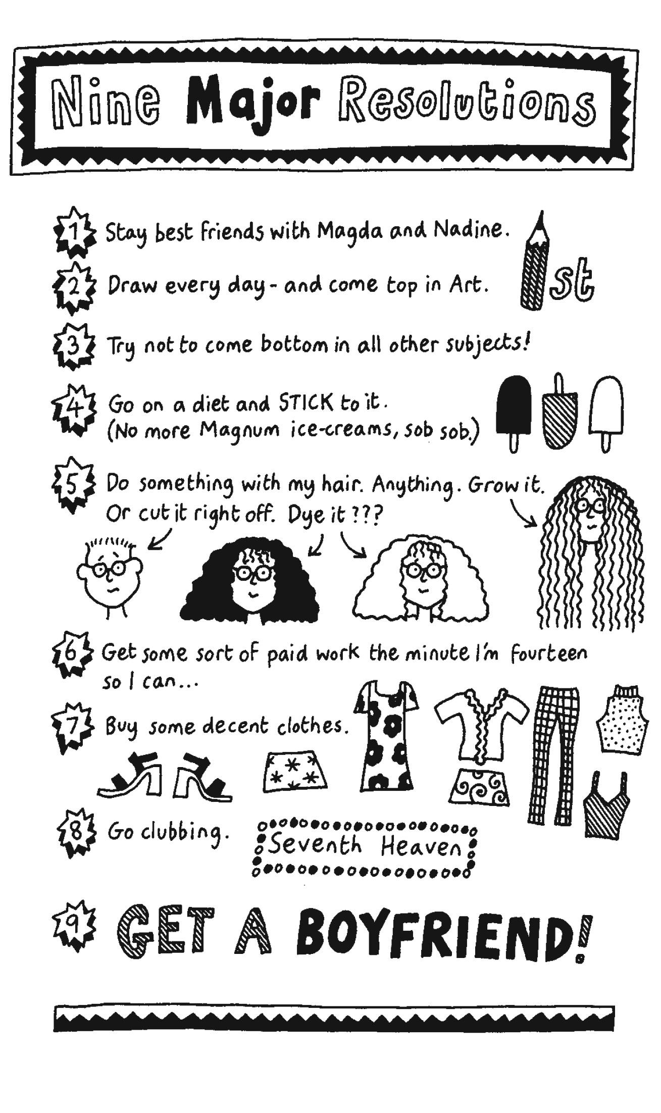 The only trouble is I haven’t got a boyfriend. Well, I haven’t got a Frida Kahlo outfit or a bedside phone or my own television and video and my bed sags because my little brother Eggs uses it as a trampoline whenever I’m not around. I could put up with all these deprivations. I’d just like a boyfriend. Please.