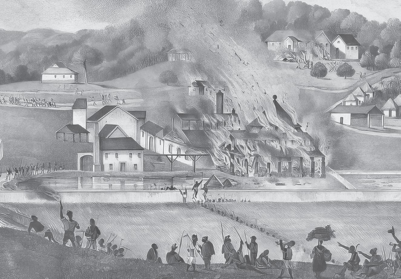 It was led by an enslaved worker and Baptist deacon named Samuel Sharpe. Thirty- one-year- old Sharpe had originally planned a peaceful sit- down strike to demand wages just after Christmas, when the sugar harvest usually began. At the same time, he began to see the need for more militant action, holding secret meetings after church services to galvanise his supporters and organising them into militia groups with ‘colonels’ and ‘captains’. On 27 December the rebellion began with an attack on the Kensington plantation, which stood on a high ridge. The rebels set it alight, with the flames visible for miles around sending a signal for attacks on surrounding plantations.17