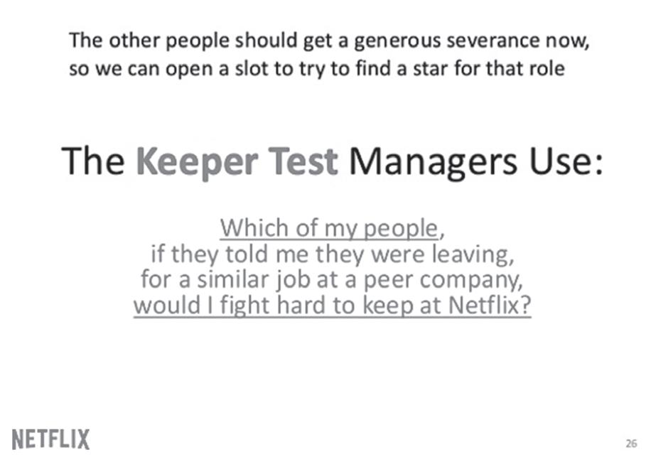 I sat down with Marc and Patty McCord—Patty had come with me from Pure Software and was head of Human Resources—and we studied the contribution of each employee. We didn’t have any obviously poor performers. So we divided the staff into two piles: the eighty highest performers who we would keep and forty less amazing ones we would let go. Those who were exceptionally creative, did great work, and collaborated well with others went immediately into the “keepers” pile. The difficulty was that there were many borderline cases. Some were great colleagues and friends but did adequate rather than great work. Others worked like crazy but showed uneven judgment and needed a lot of hand-holding. A few were exceptionally