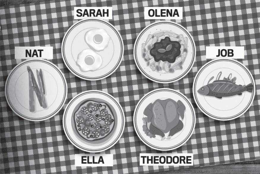If each person at the table swaps their plate with the person sitting directly opposite them, and then passes the new plate to the person sitting on their left, what dish does Sarah end up eating?