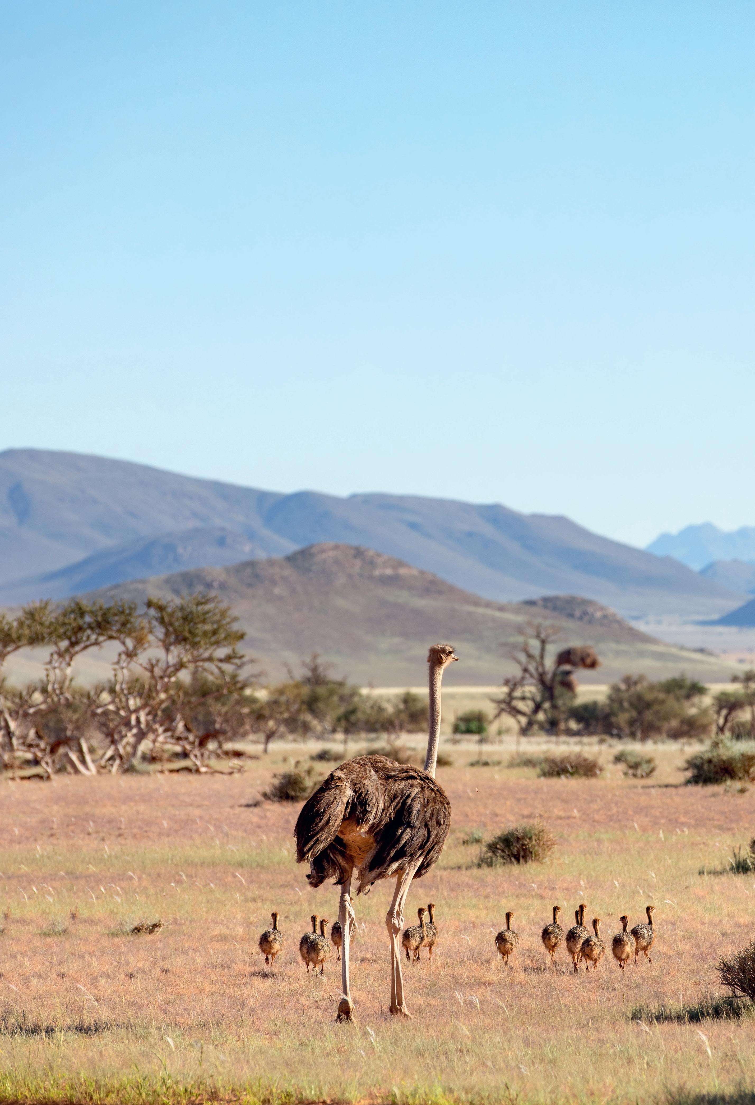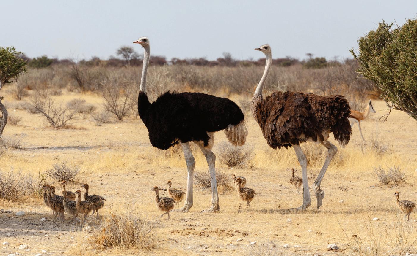Can deliver dangerous kicks if threatened Black (male) and lighter brown (female) feathers withstand heat and help avoid detection by predators