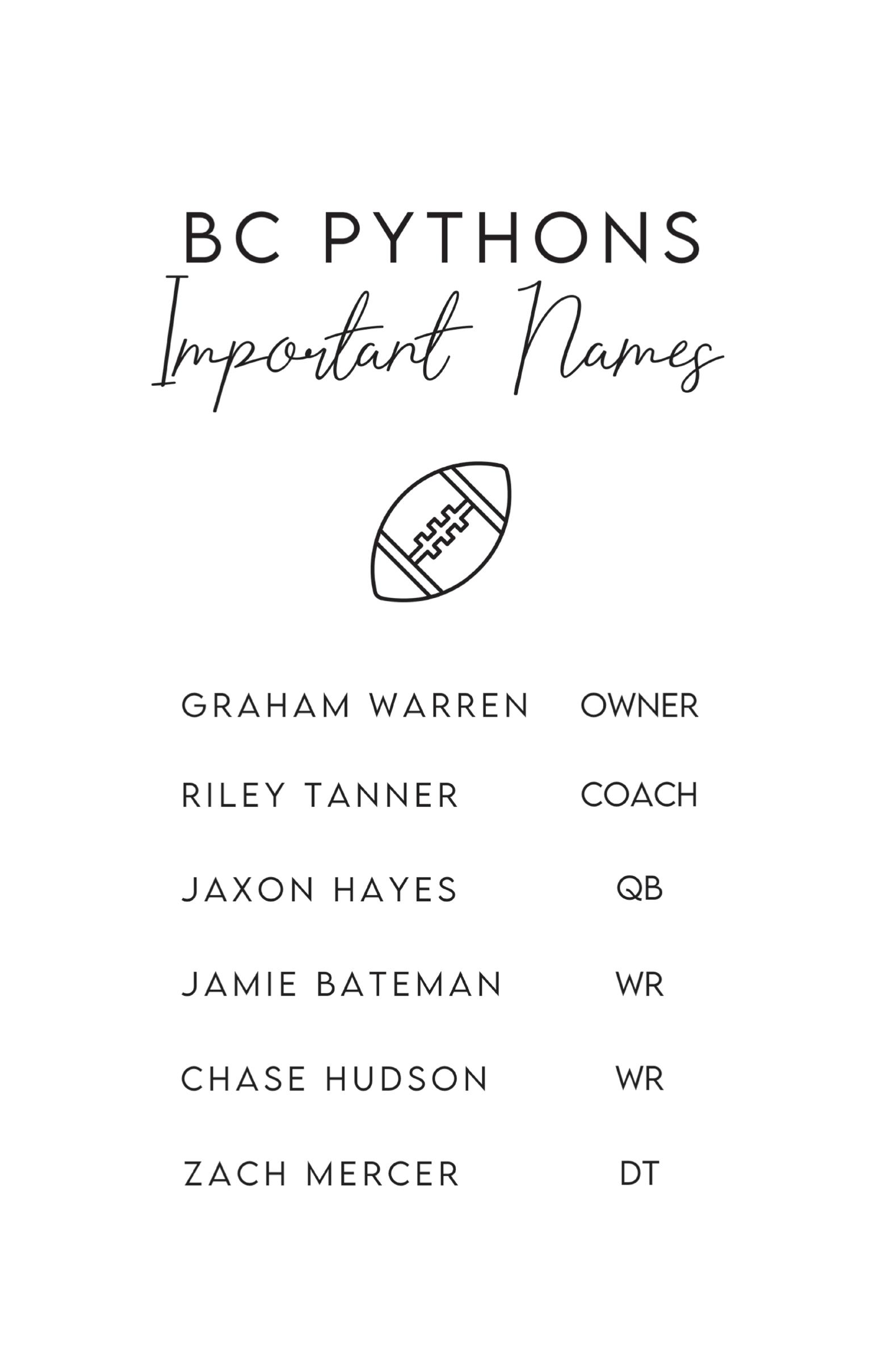 I swallow, running through options in my head. I’ve never been much for money. It doesn’t drive me or even give me surface-level happiness. The most important thing to me is my family. Everything I’ve done has been to make them proud. With a Vancouver Warriors legacy hockey star as a father, my choosing football instead of what was expected of me has always lingered in the back of my mind.