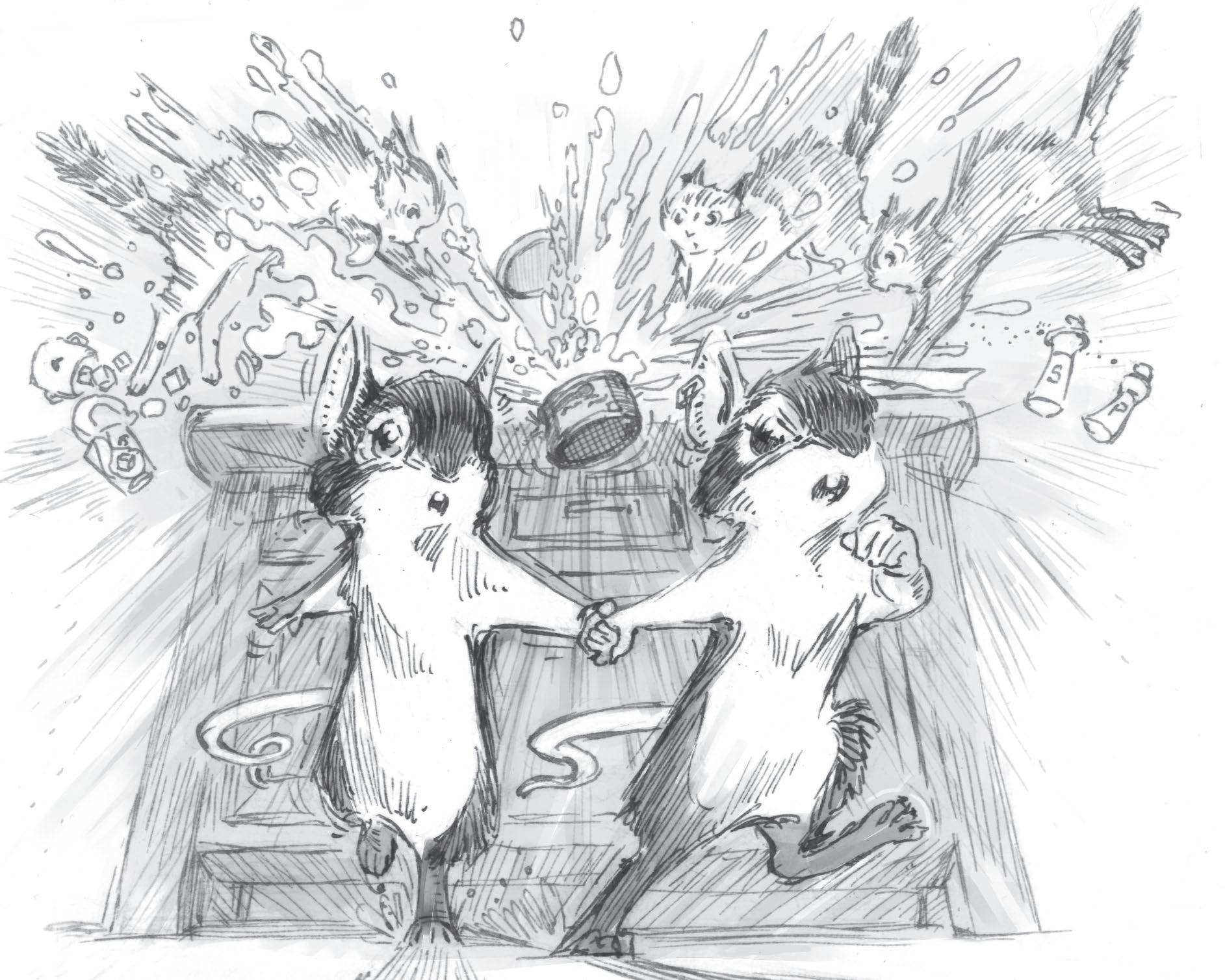 My whiskers stick out straight in shock. This sneak attack has caught us by surprise! My heart is racing, which is really saying something, because mouse hearts already beat ten times faster than human ones. I’m so terrified, I’m up to seven hundred beats per minute.
